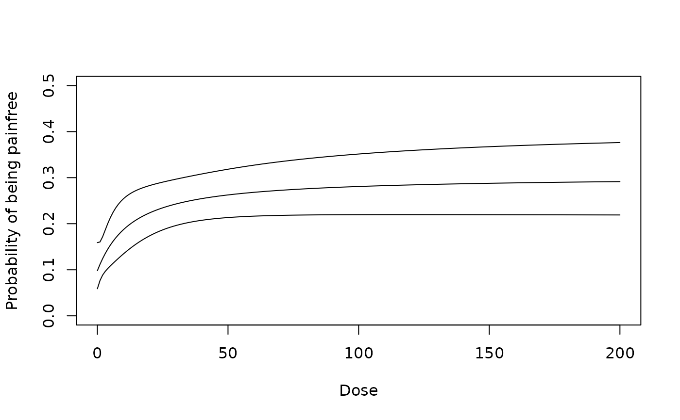 ylab = "Probability of being painfree", xlab = "Dose")