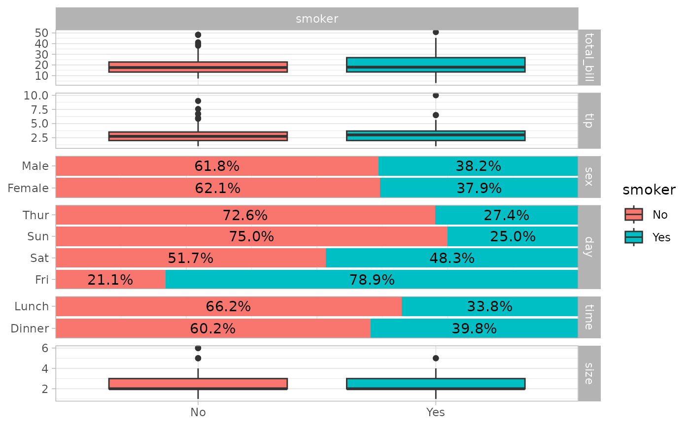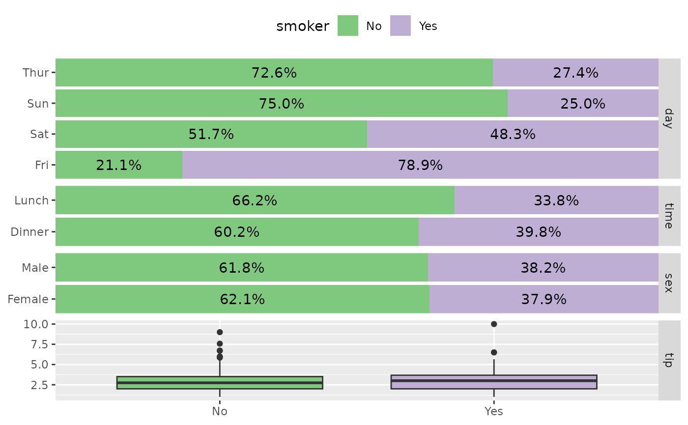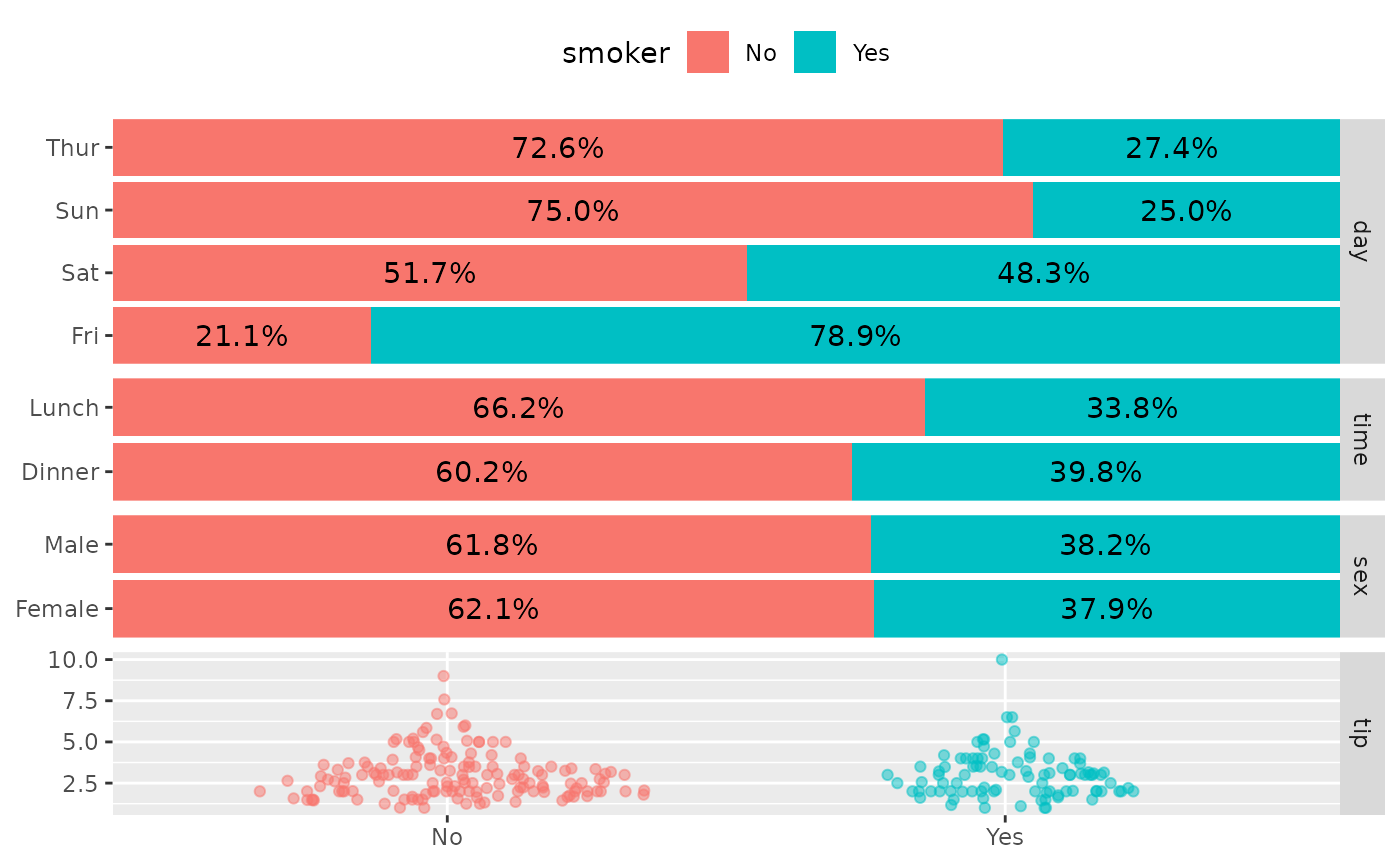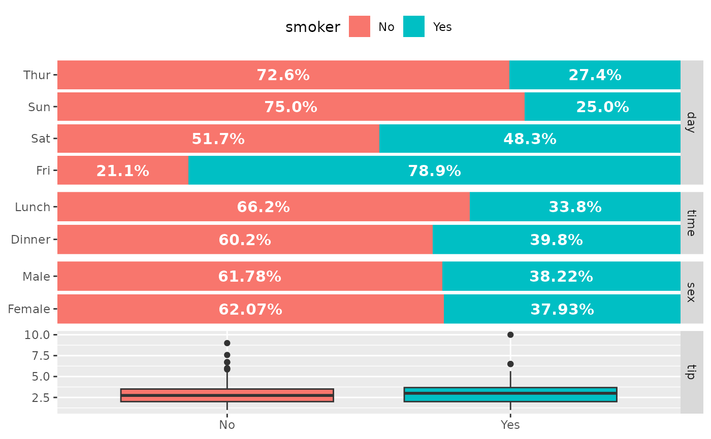 ggbivariate(tips, "smoker", legend = 3)