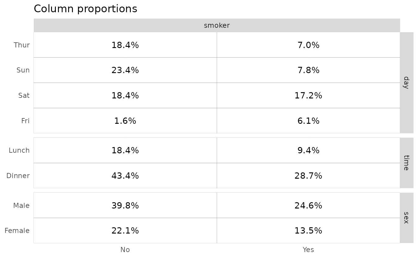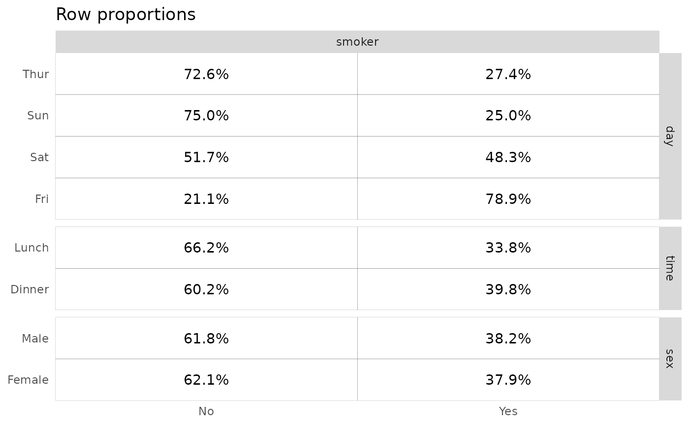 display. For proportions of the total, row proportions or columns