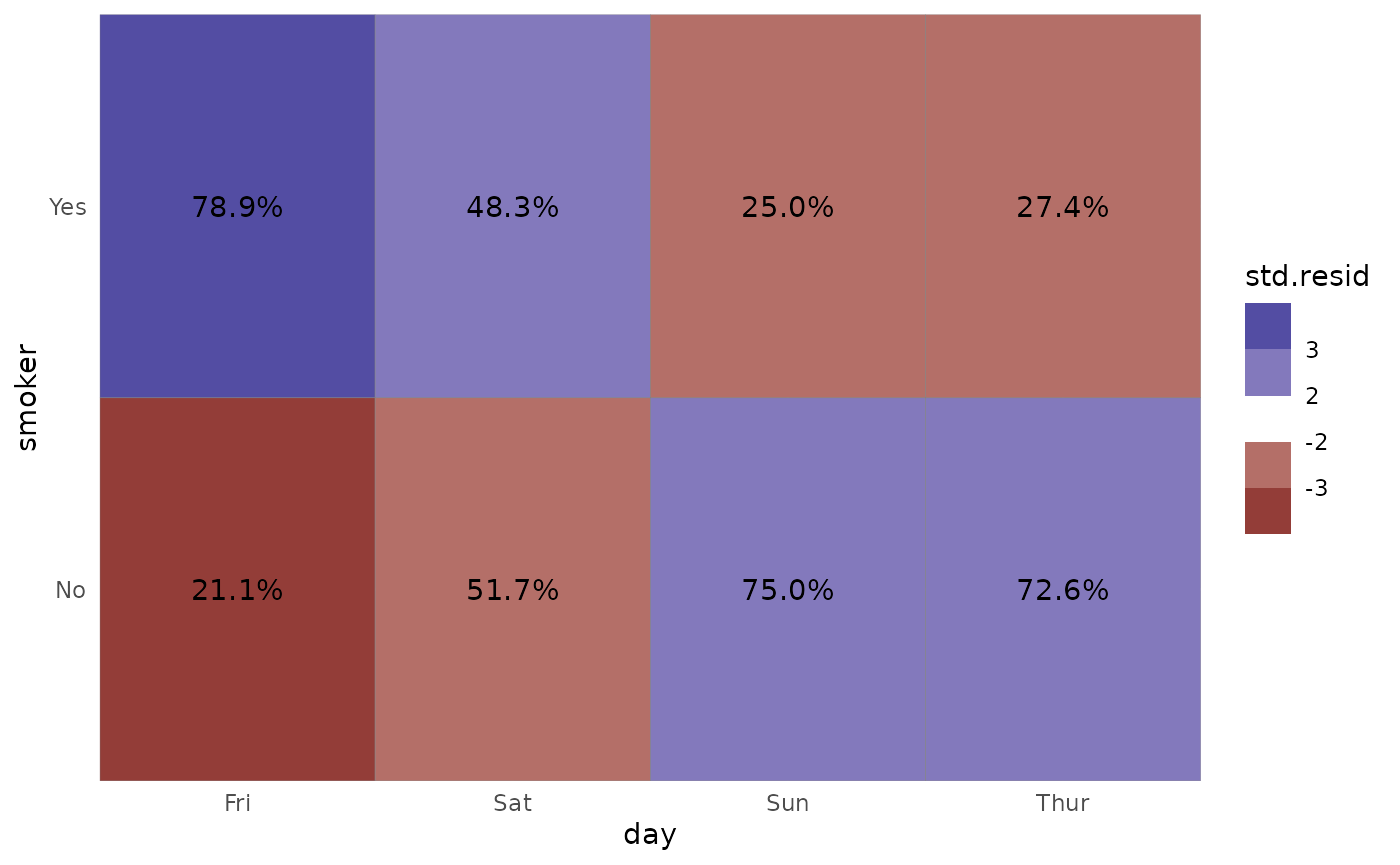 ggally_crosstable(tips, aes(x = day, y = smoker), cells = "col.prop", fill = "std.resid")