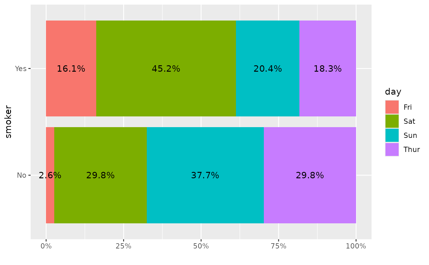 ggally_rowbar(tips, aes(x = day, y = smoker))
