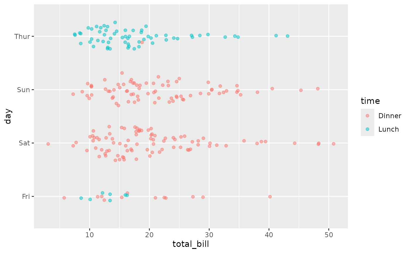 ggally_dot_no_facet(tips, aes(x = total_bill, y = day, colour = time))
