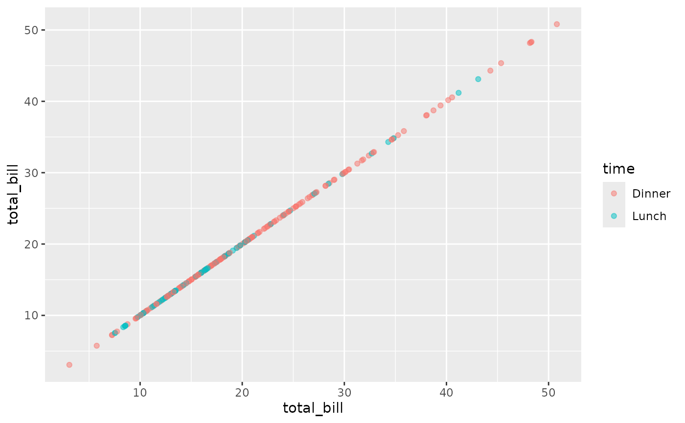ggally_autopoint(tips, aes(x = total_bill, y = tip, colour = time))