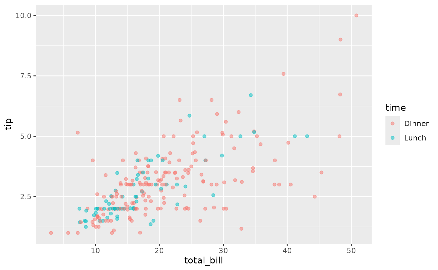 ggally_points(tips, aes(x = total_bill, y = tip, colour = time))