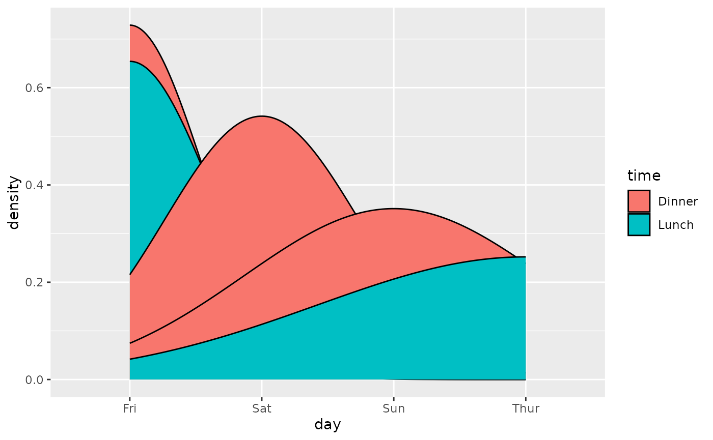 ggally_densityDiag(tips, aes(x = day, colour = time))