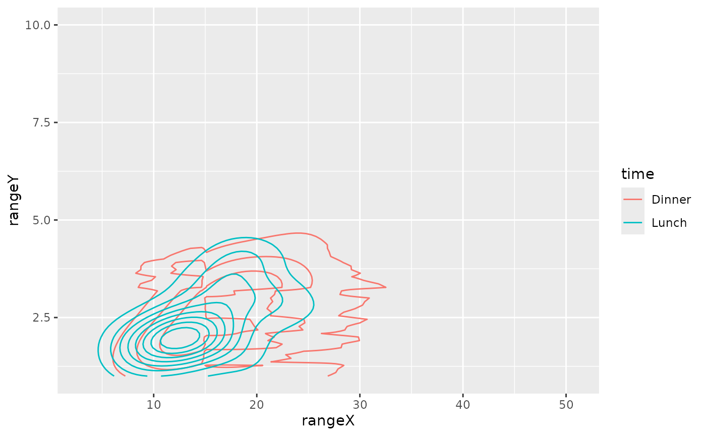 ggally_density(tips, aes(x = total_bill, y = tip, colour = time))