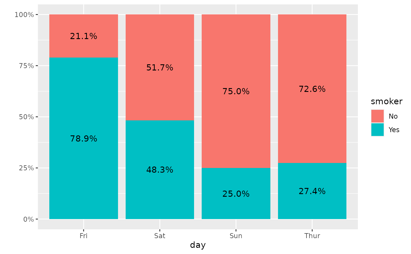 ggally_crosstable(tips, aes(x = day, y = smoker))