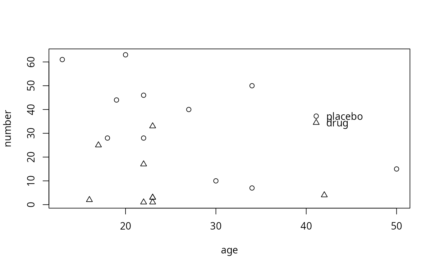legend(40, 40, legend = levels(polyps$treat), pch = 1:2, bty = "n")