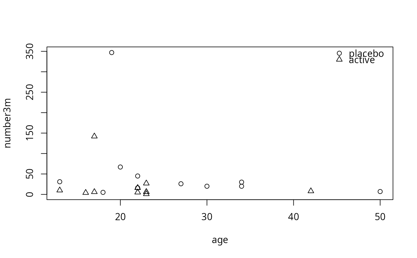legend("topright", legend = levels(polyps3$treatment), pch = 1:2, bty = "n")