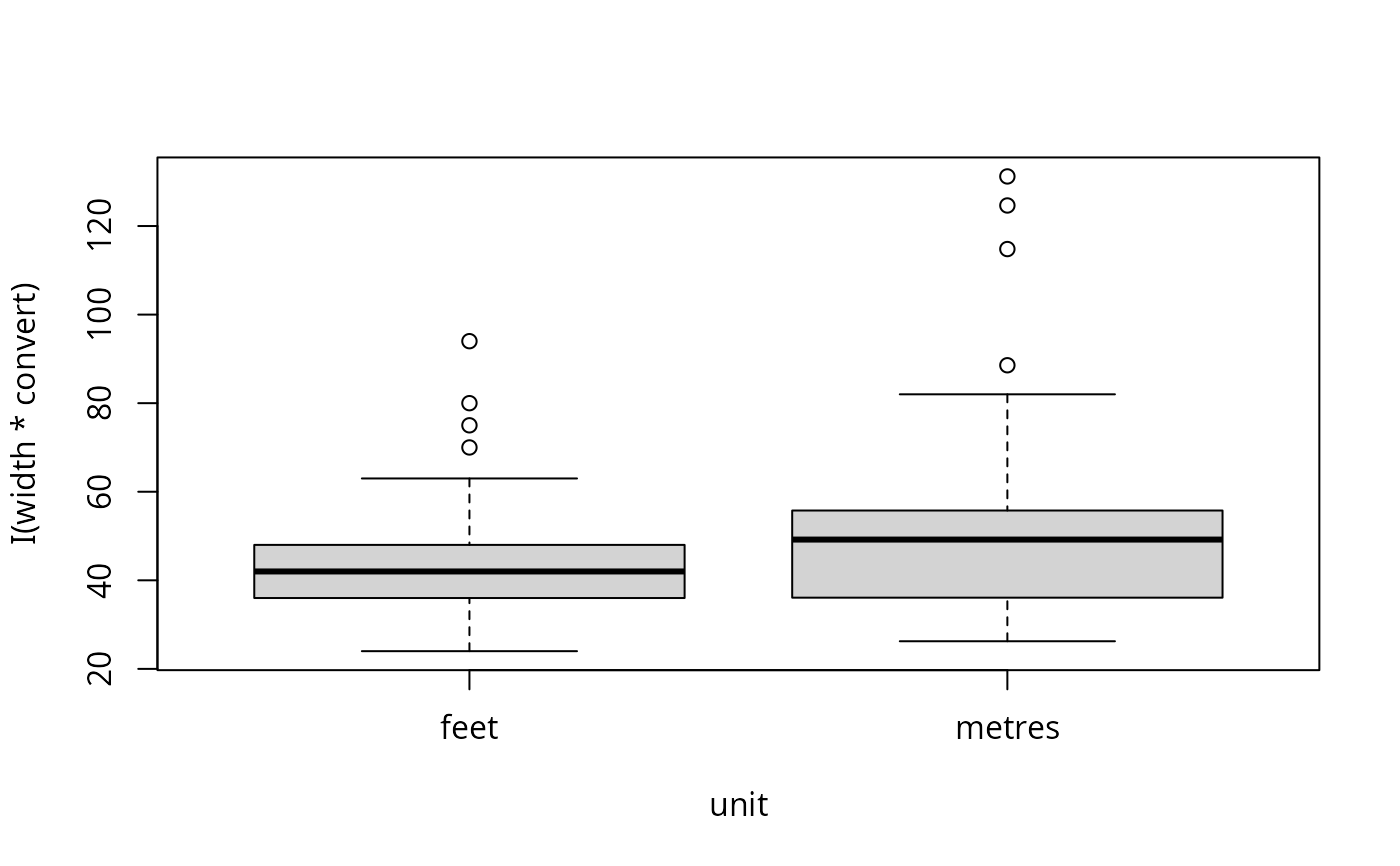 Shortly after metric units of length were officially introduced in Australia, each of a group of 44 students was asked to guess, to the nearest metre, the width of the lecture hall in which they were sitting. Another group of 69 students in the same room was asked to guess the width in feet, to the nearest foot. The data were collected by Professor T. Lewis and are taken from Hand et al (1994). The main question is whether estimation in feet and in metres gives different results.