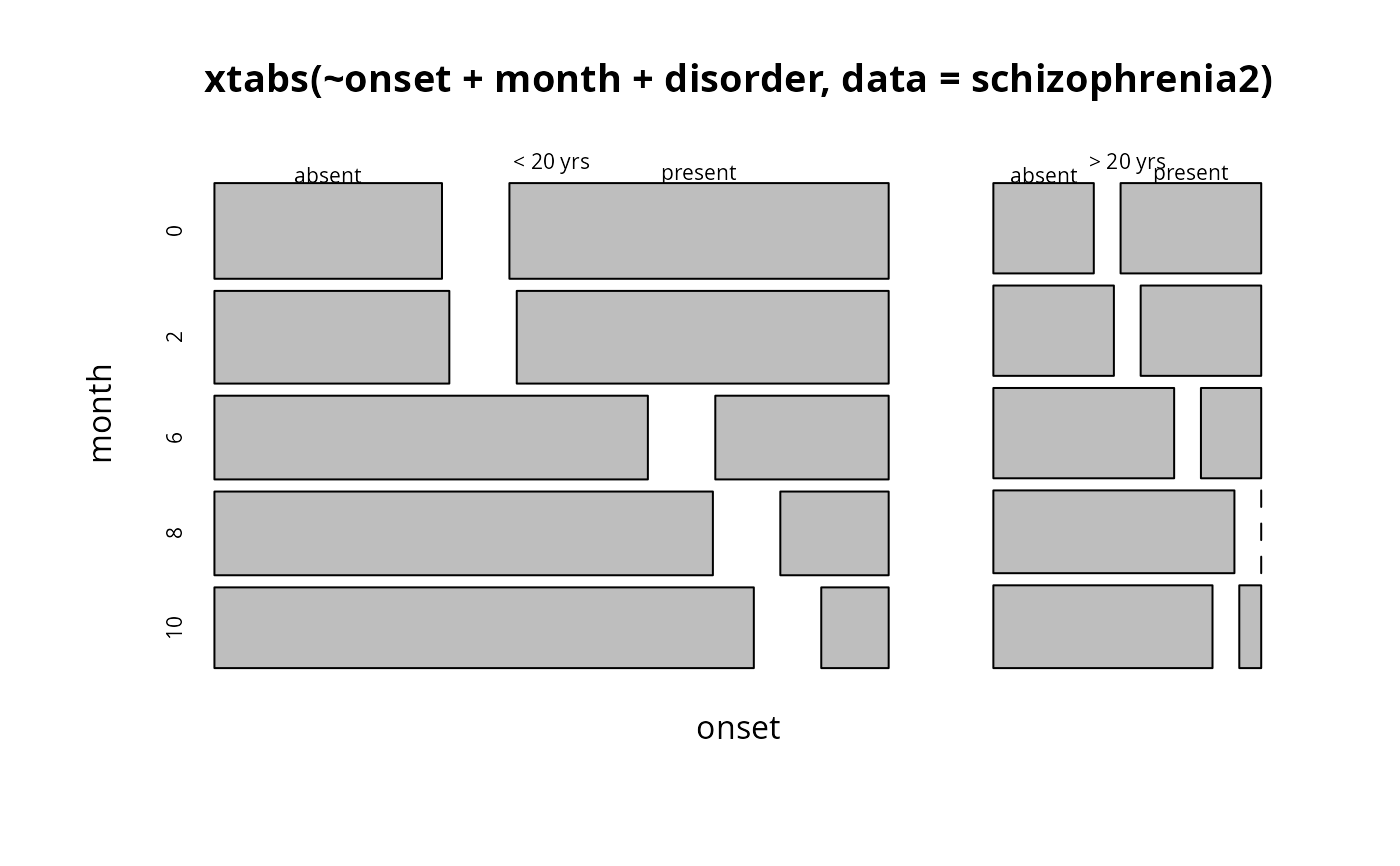 mosaicplot(xtabs( ~ onset + month + disorder, data = schizophrenia2))