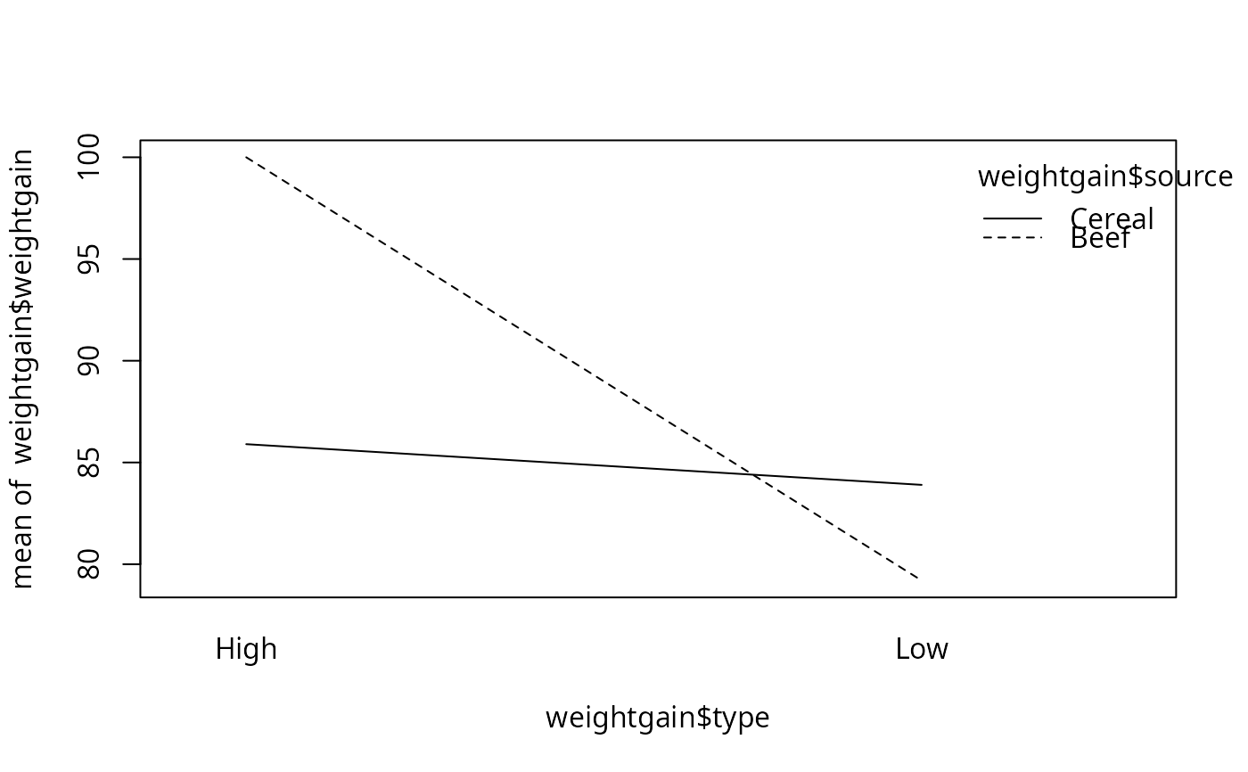weightgain.RdThe data arise from an experiment to study the gain in weight of rats fed on four different diets, distinguished by amount of protein (low and high) and by source of protein (beef and cereal).