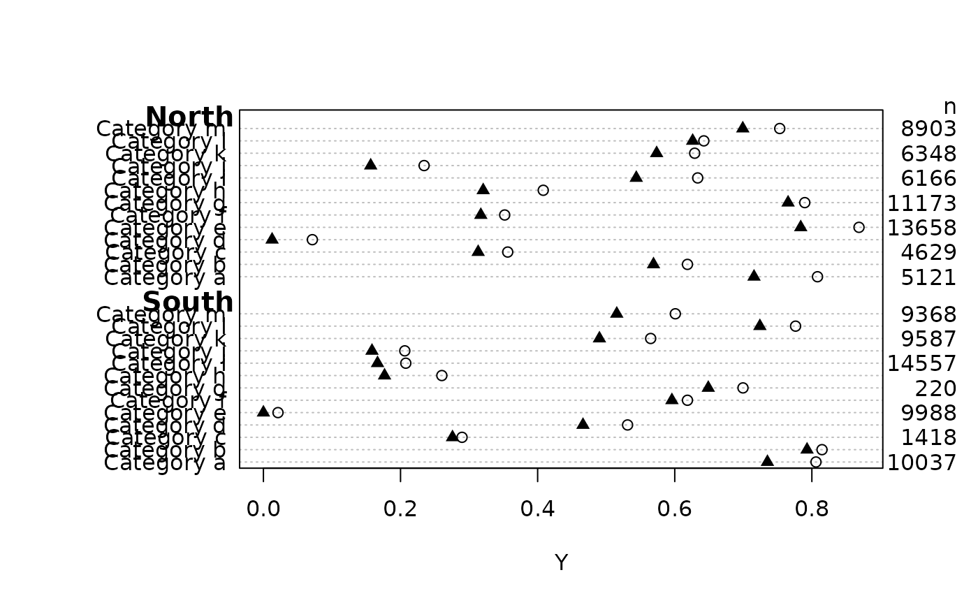 dotchart3(cbind(y1,y2), g, groups=maj, auxdata=n, auxtitle='n',