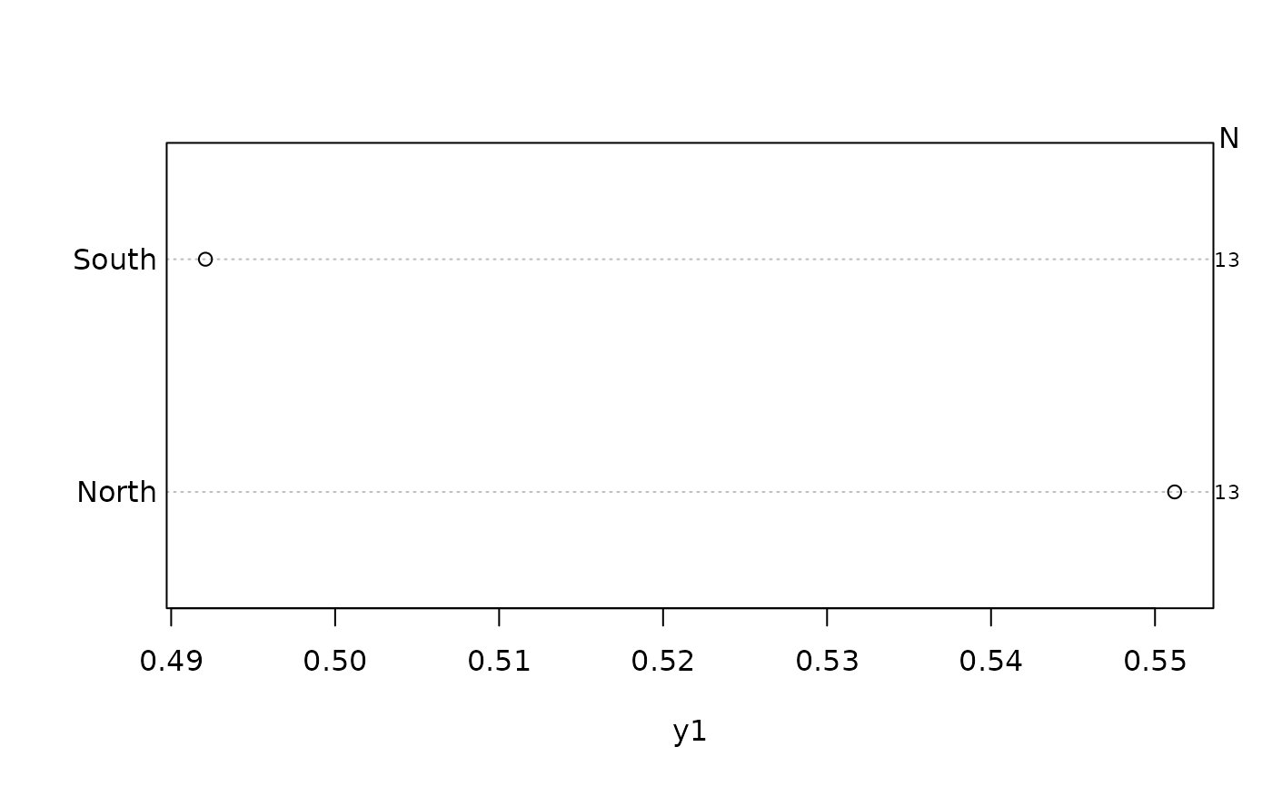 summaryD(y1 ~ maj, fun=function(y) c(Mean=mean(y), n=length(y)),