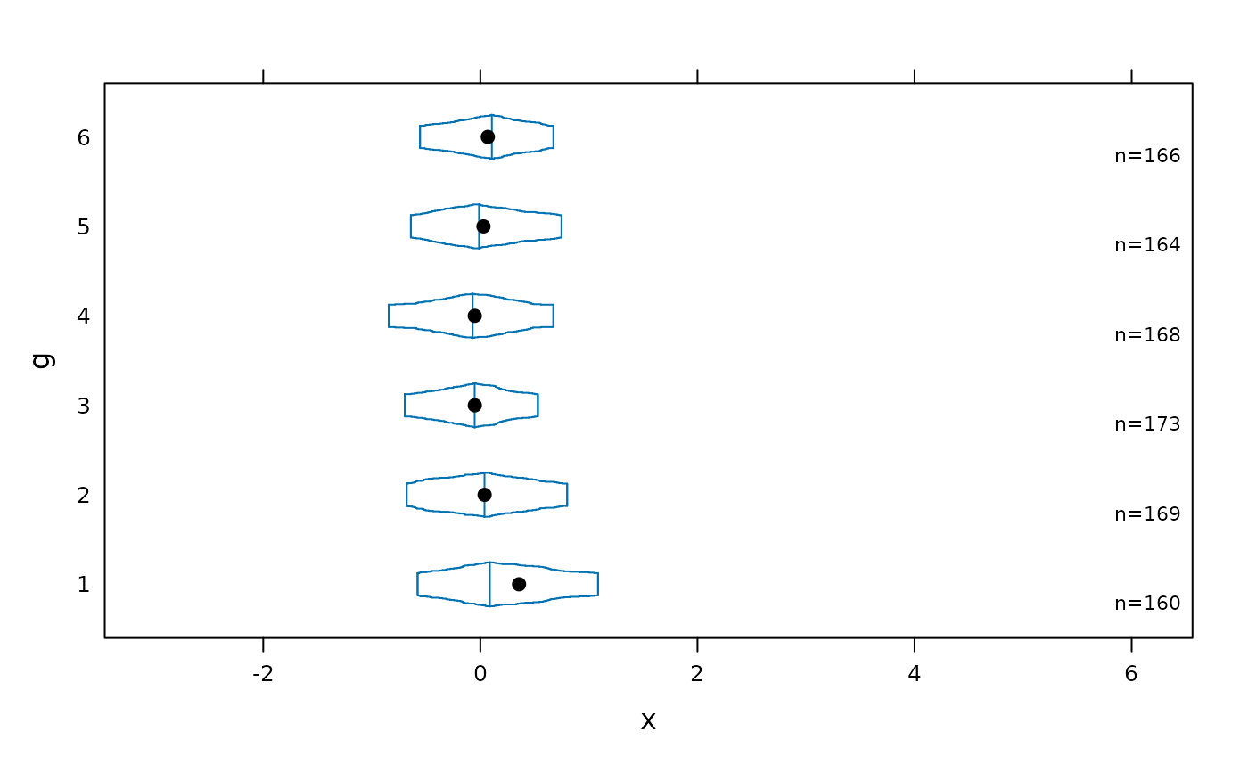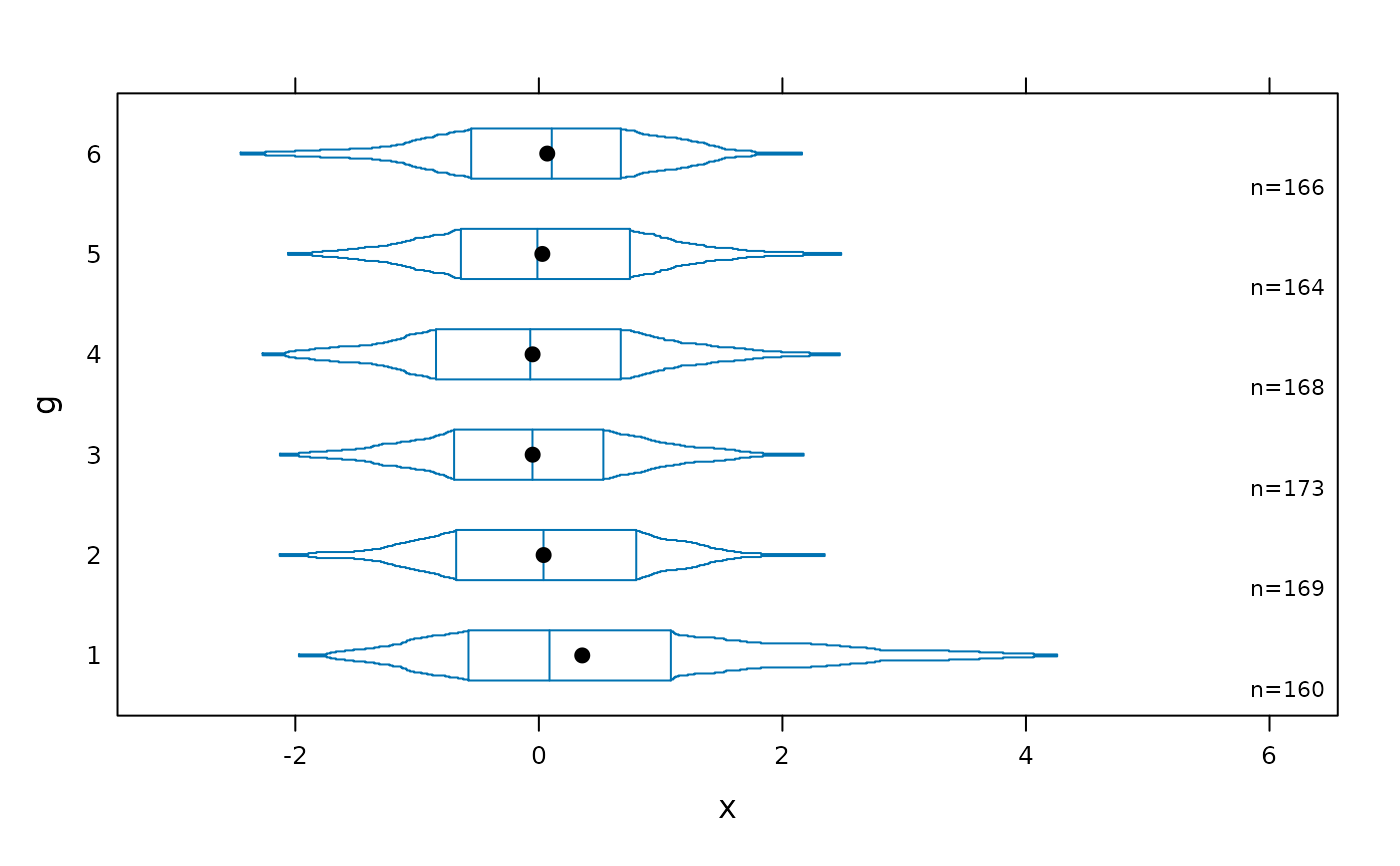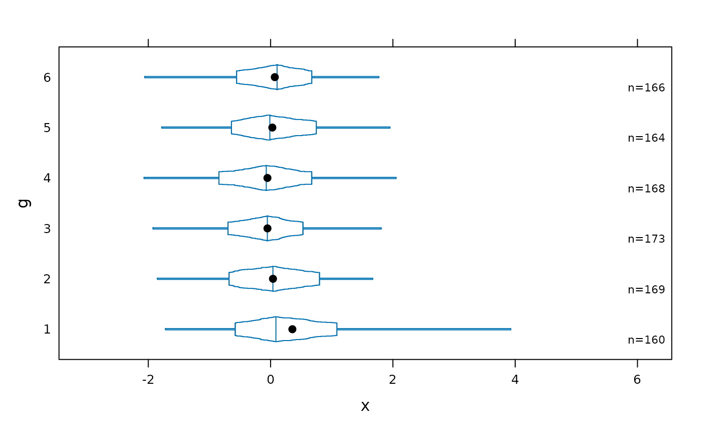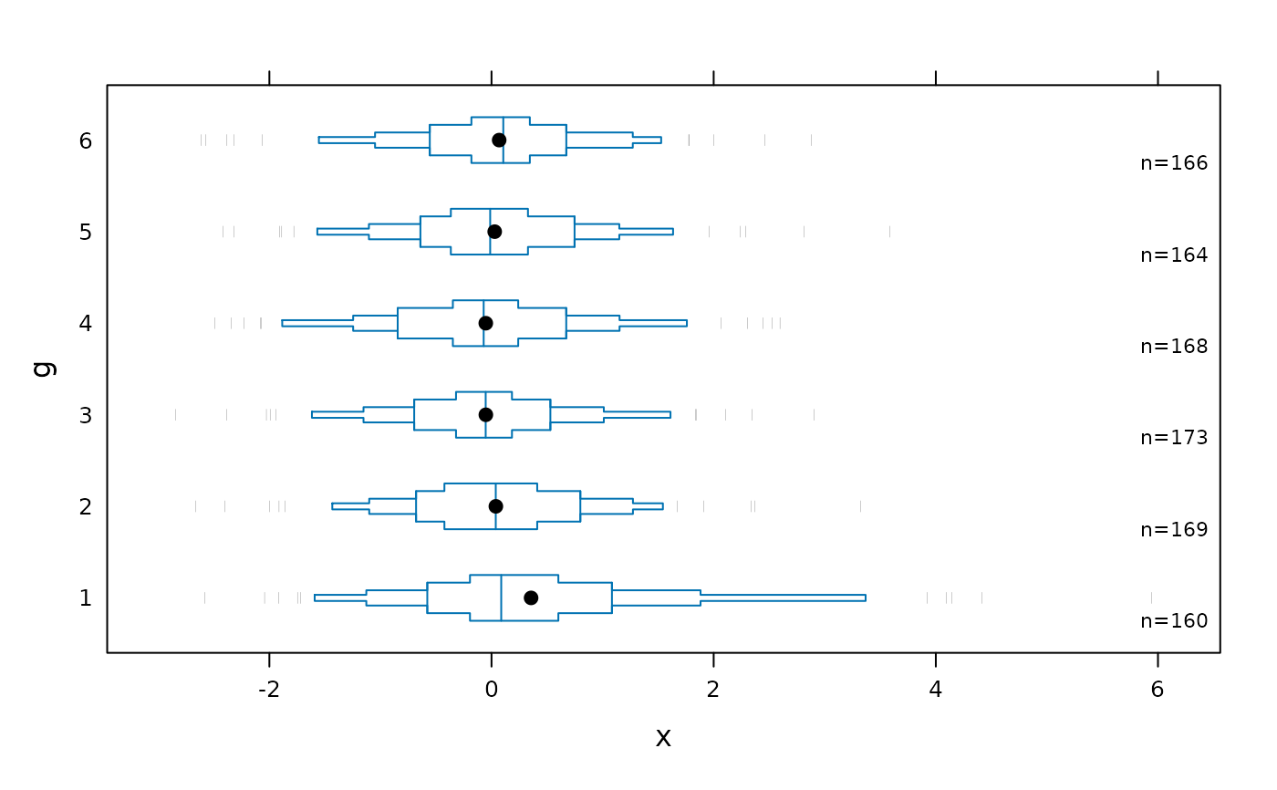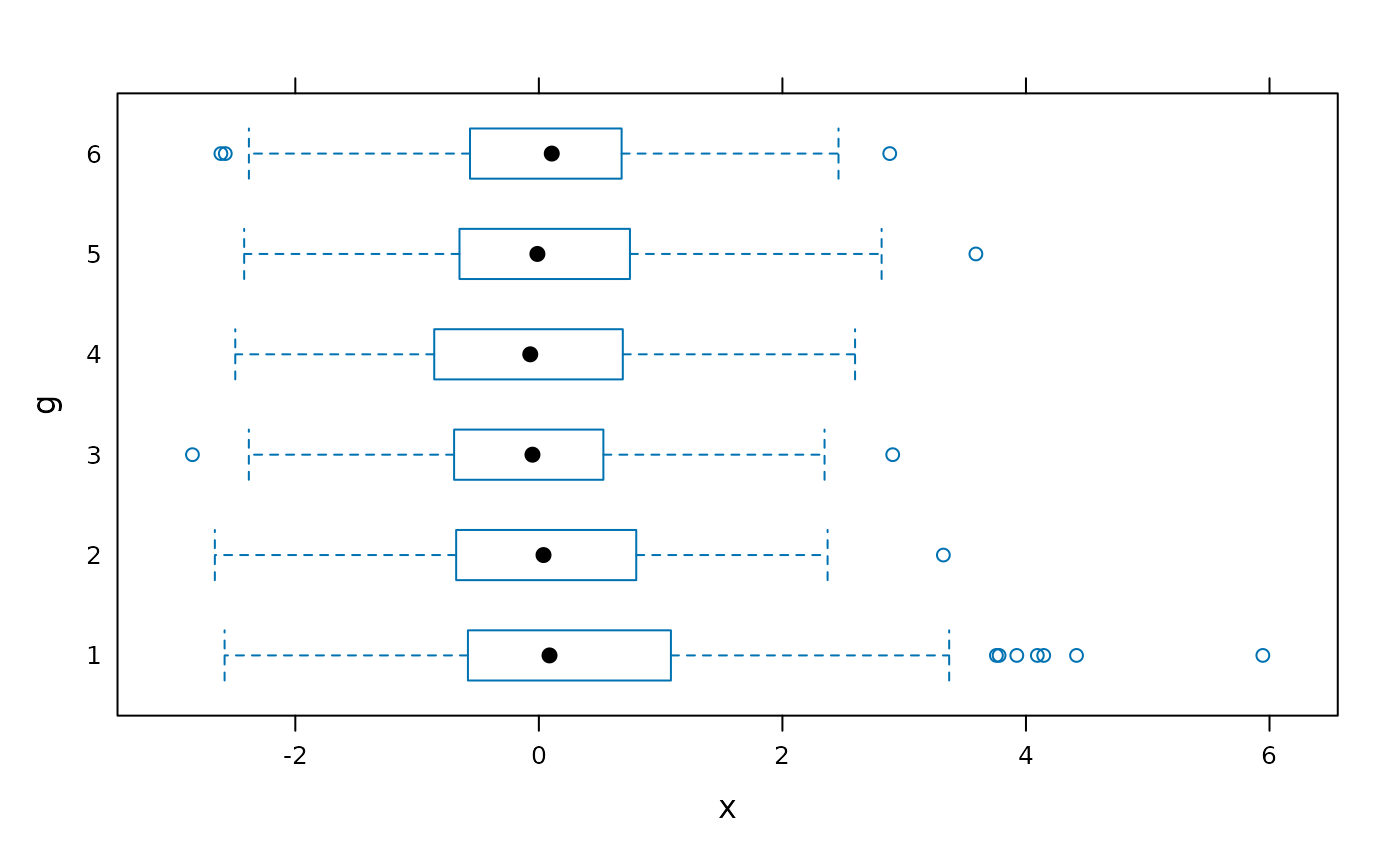 bwplot(g ~ x, panel=panel.bpplot, cex.means=.3)