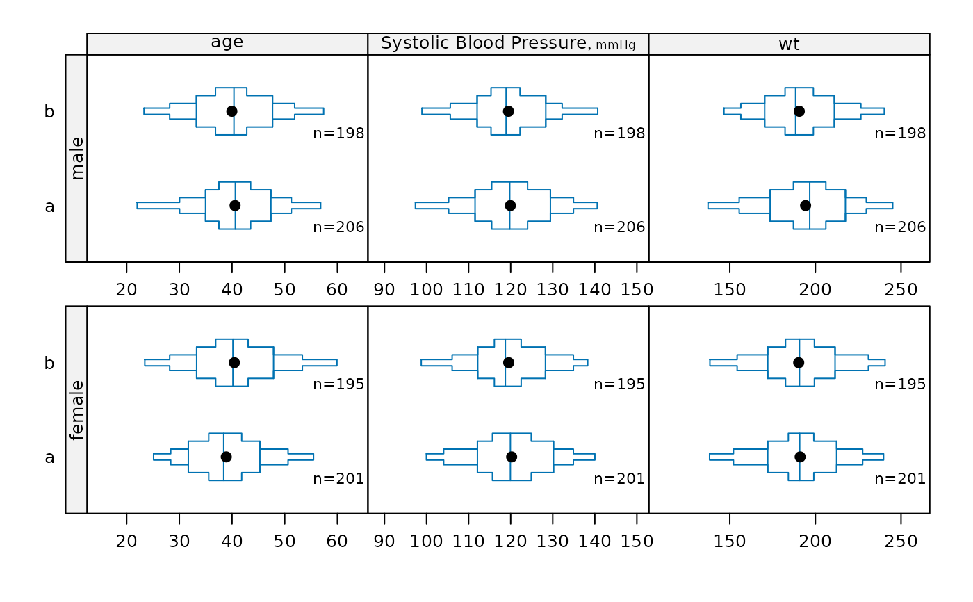bpplotM(age + bp + wt ~ treatment, data=d, nloc='left')