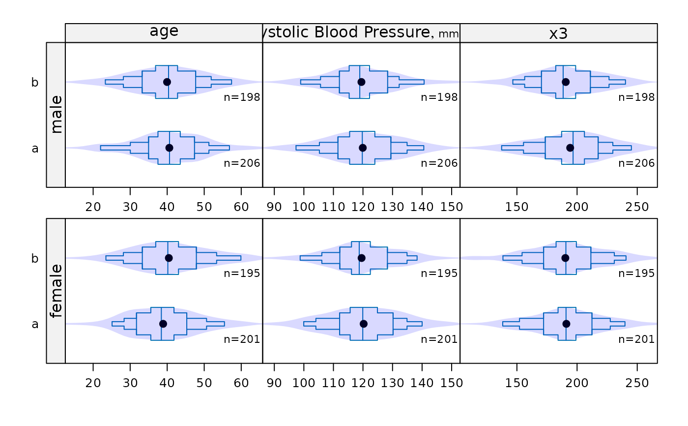 bpplotM(age + bp + wt ~ treatment * sex, data=d, cex.strip=.8)
