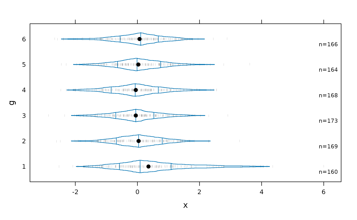 bwplot(g ~ x, panel=panel.bpplot, probs=seq(.01,.49,by=.01), datadensity=TRUE)