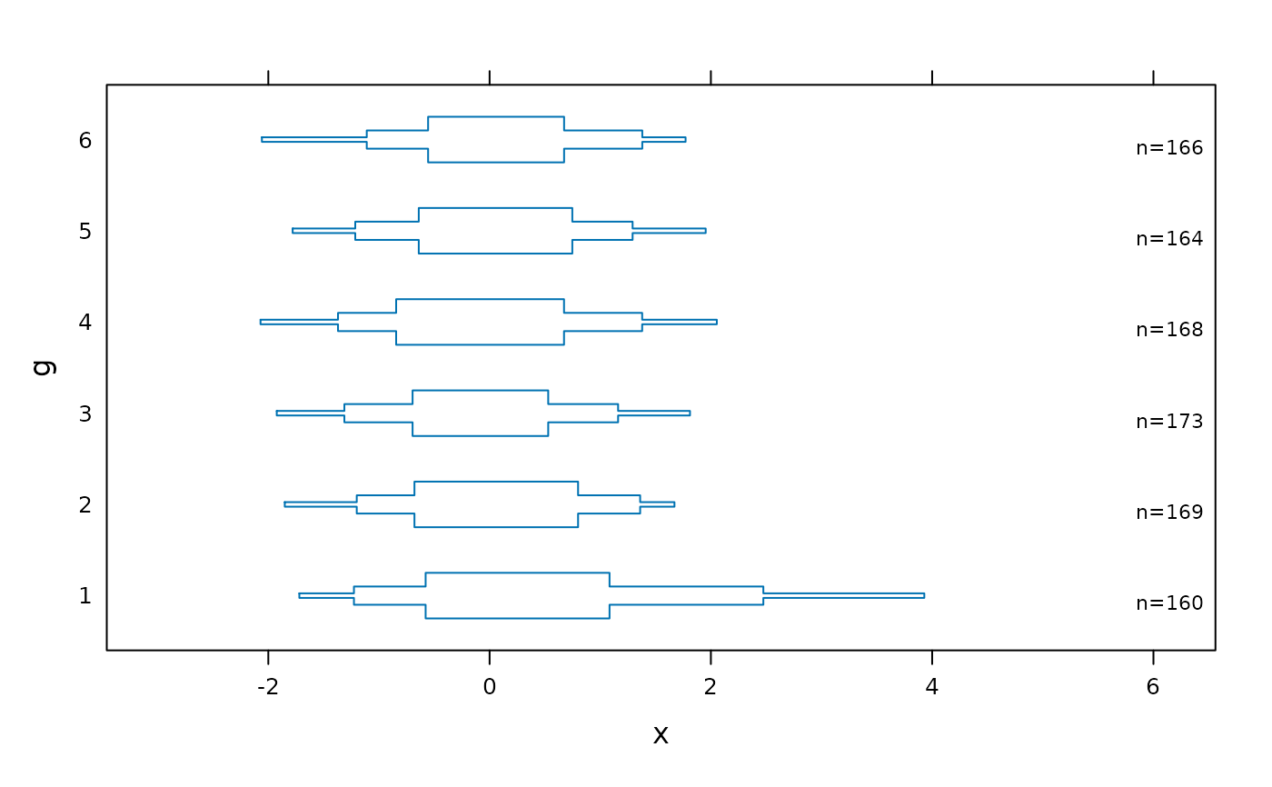 bwplot(g ~ x, panel=panel.bpplot, nout=5)