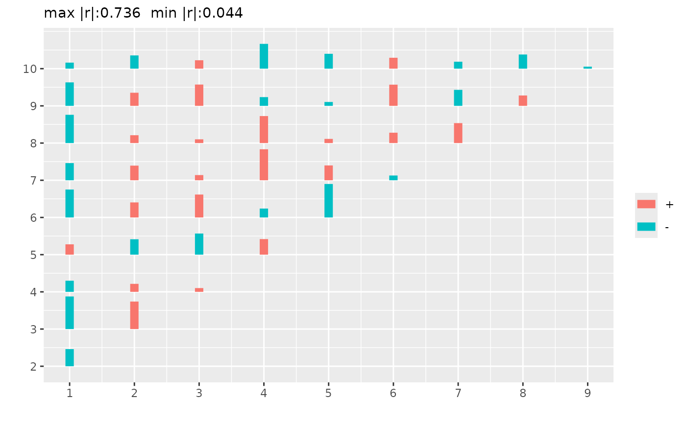 Constructs two ggplot2 graphics. The first is a half matrix of rectangles where the height of the rectangle is proportional to the absolute value of the correlation coefficient, with positive and negative coefficients shown in different colors. The second graphic is a variogram-like graph of correlation coefficients on the y-axis and absolute time gap on the x-axis, with a loess smoother added. The times are obtained from the correlation matrix's row and column names if these are numeric. If any names are not numeric, the times are taken as the integers 1, 2, 3, ... The two graphics are ggplotly-ready if you use plotly::ggplotly(..., tooltip='label').