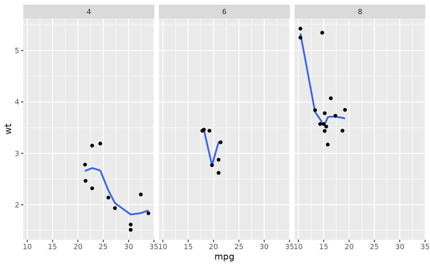 c <- ggplot(mtcars, aes(y=wt, x=mpg)) + facet_grid(. ~ cyl)