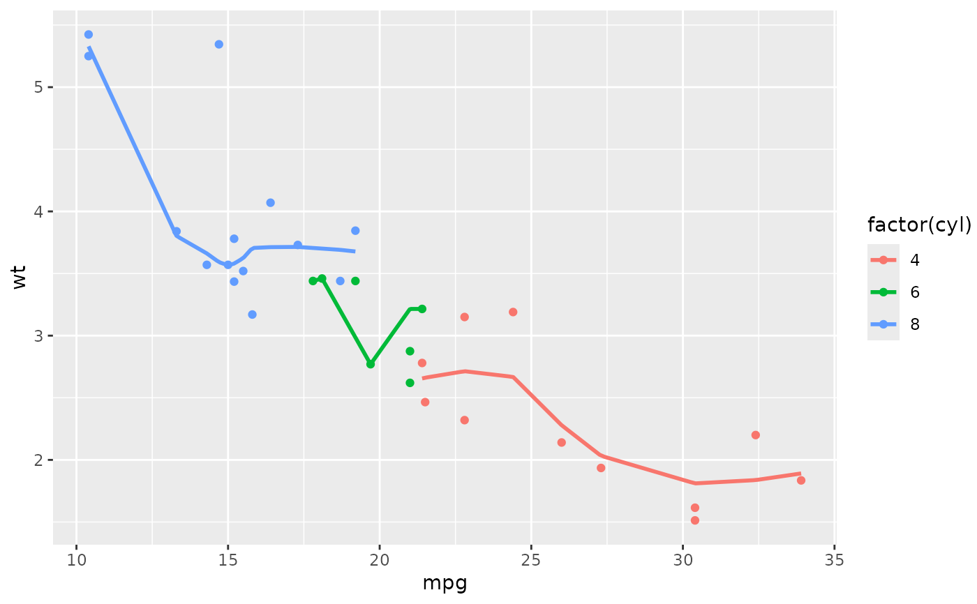 c + stat_plsmo(aes(fill = factor(cyl))) + geom_point()