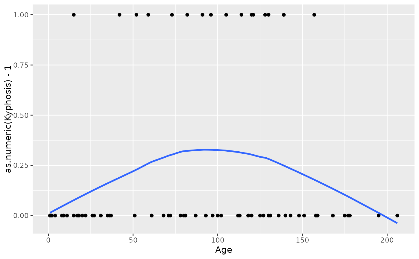 qplot(Age, as.numeric(Kyphosis) - 1, data = kyphosis) + stat_plsmo()