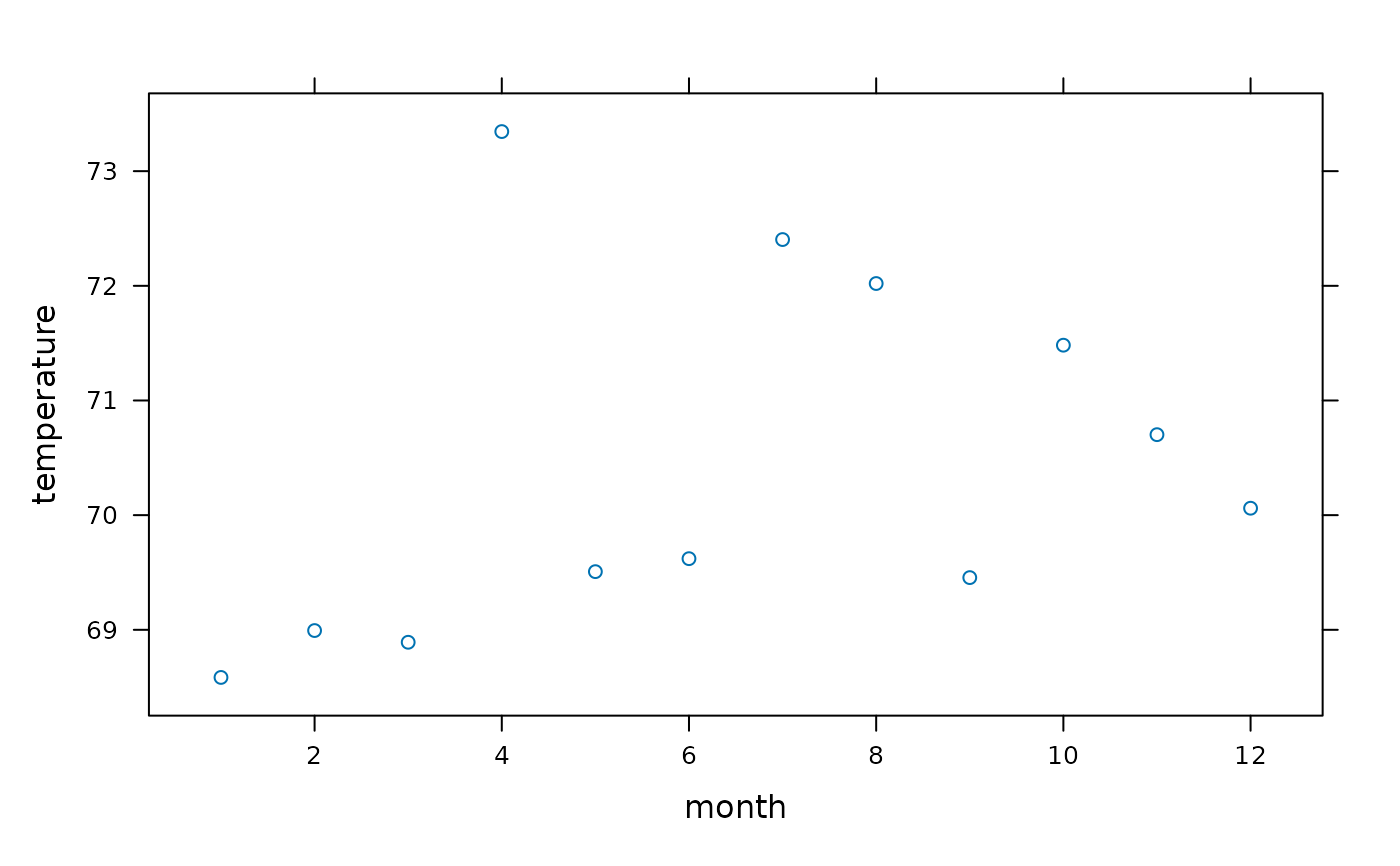 xyplot(temperature ~ month, data=w) # plot mean temperature by month