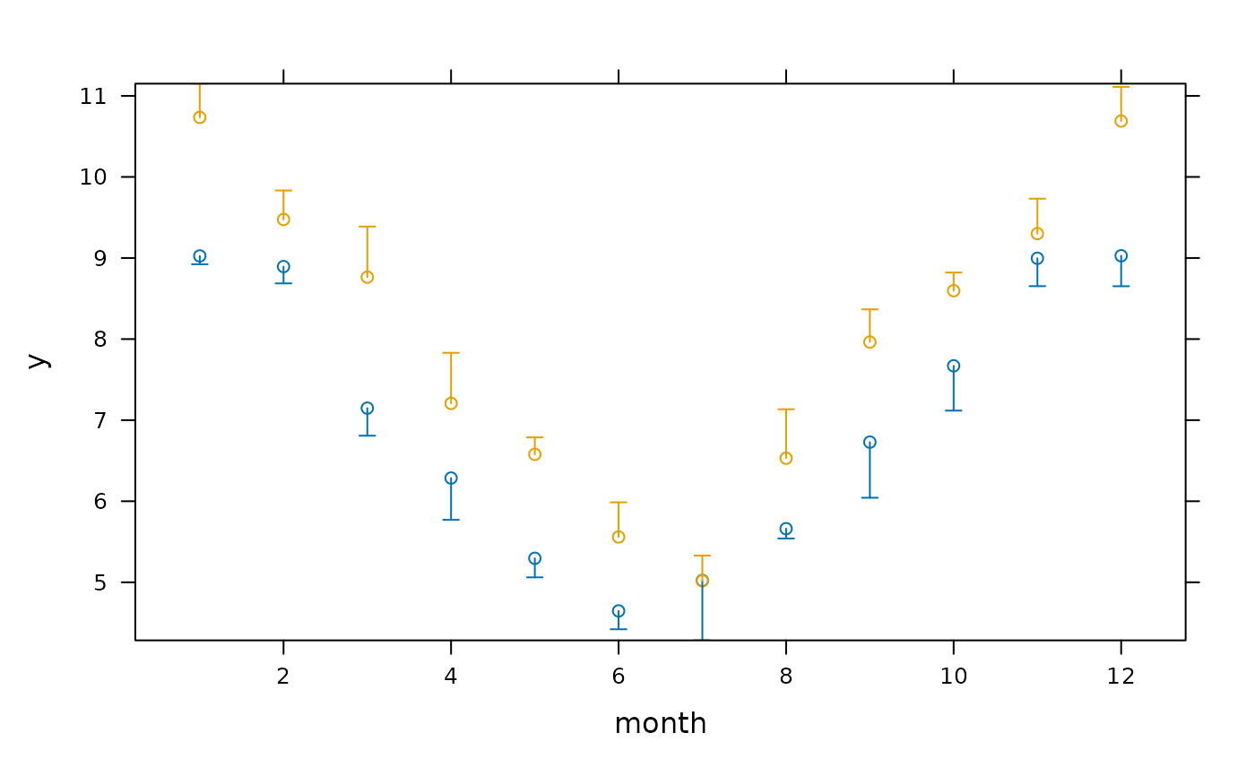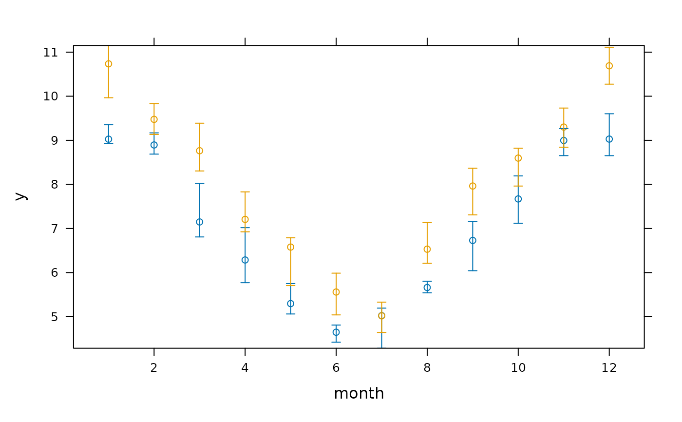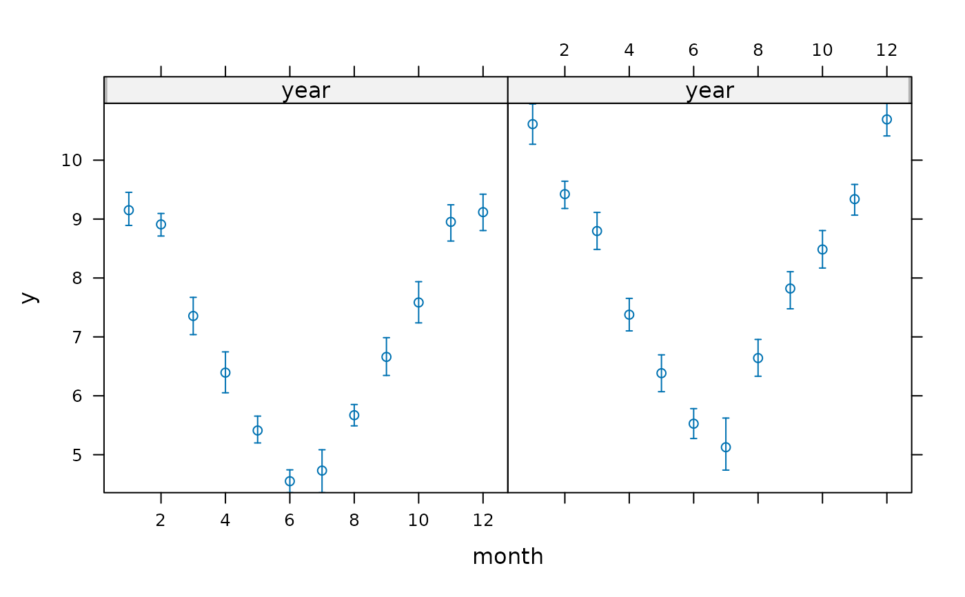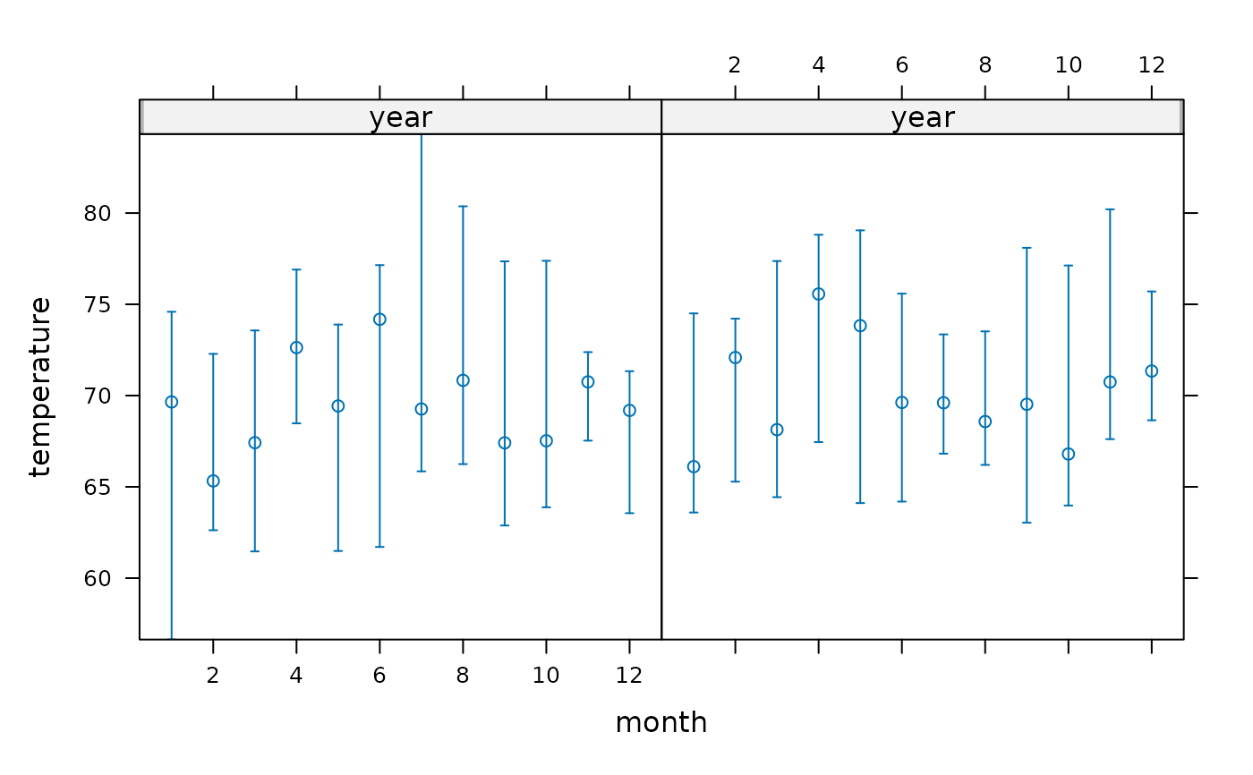 xYplot(Cbind(temperature[,1],temperature[,-1]) ~ month | year, data=w)