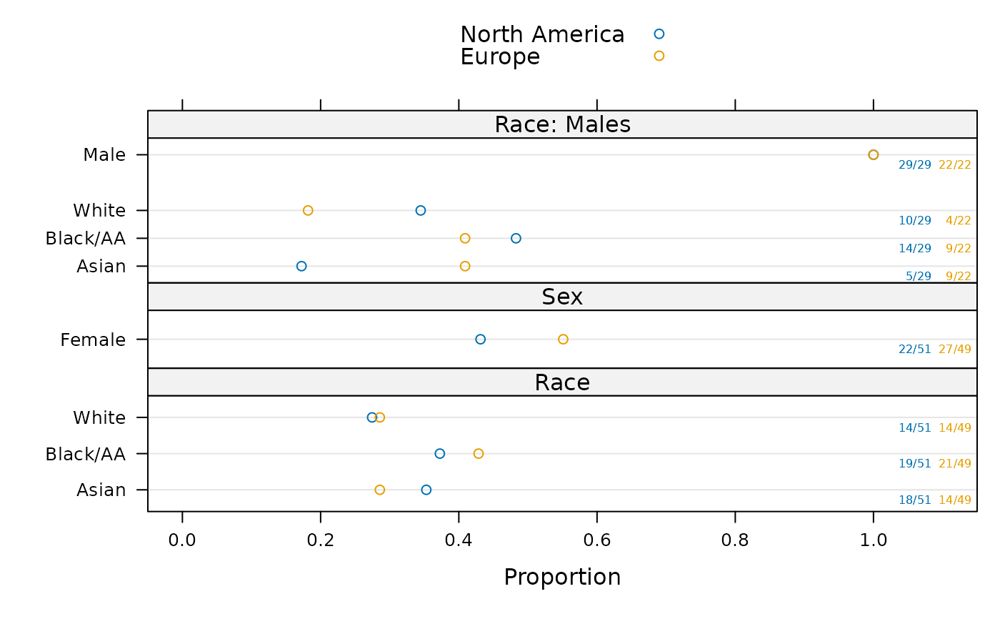 plot(summaryP(race + sex ~ region, data=d), exclude1=FALSE, col='green')
