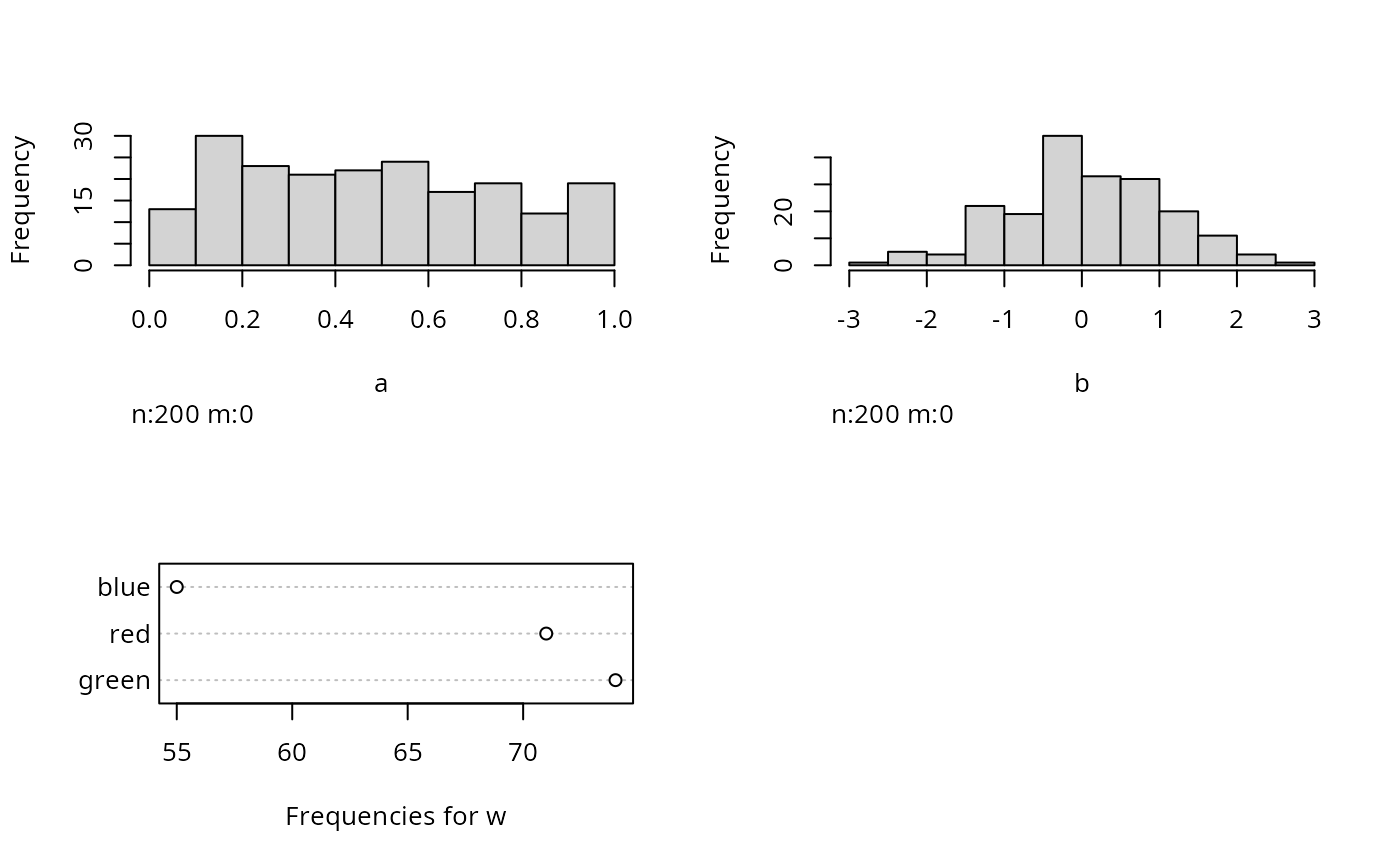 hist.data.frame.RdThis functions tries to compute the maximum number of histograms that will fit on one page, then it draws a matrix of histograms. If there are more qualifying variables than will fit on a page, the function waits for a mouse click before drawing the next page.