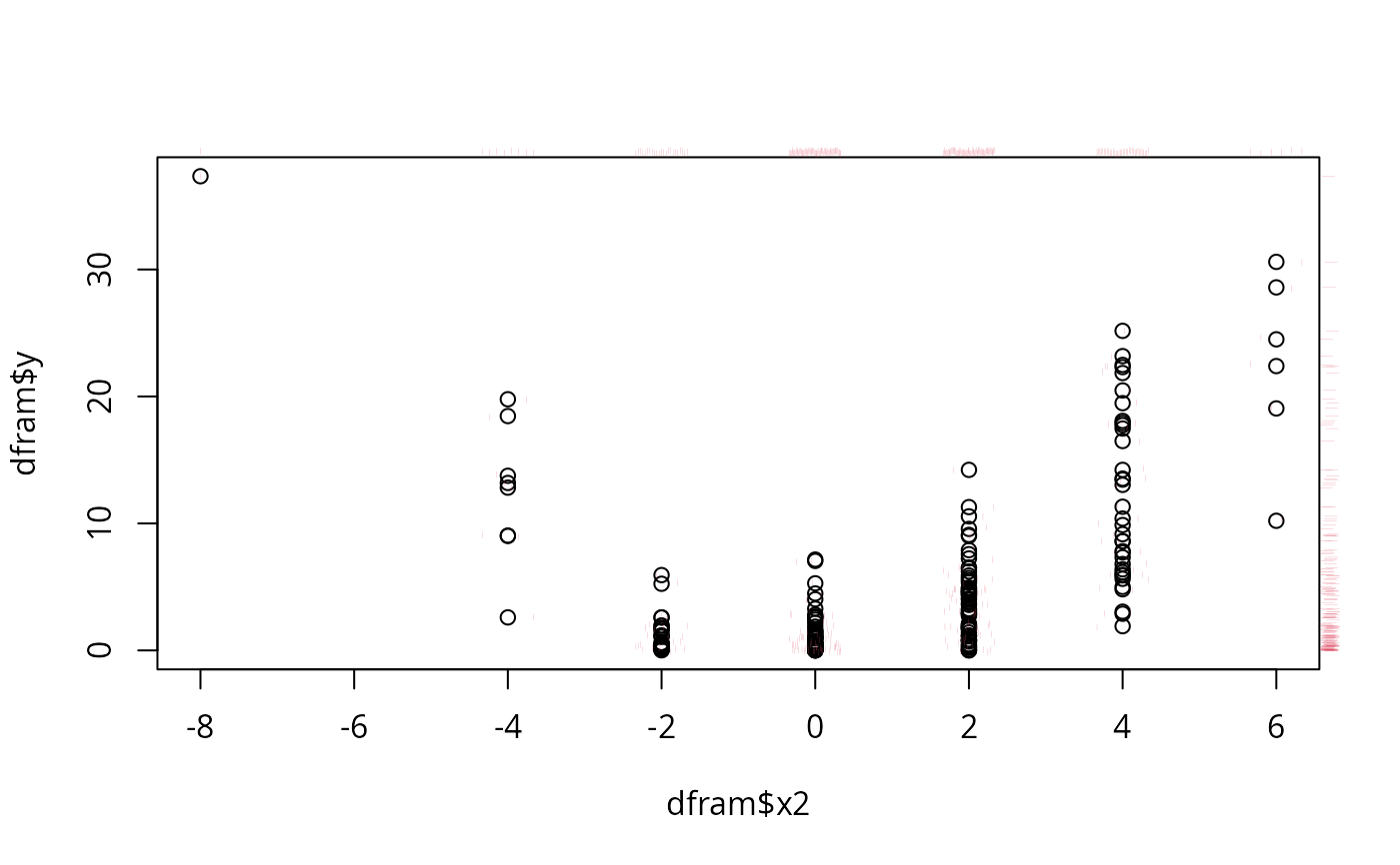 plot(dfram$x2, dfram$y) # jitter2 via scat1d