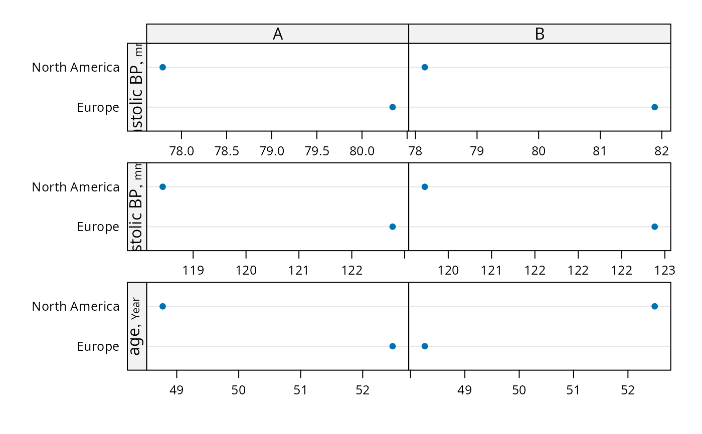 s <- summaryS(age + sbp + dbp ~ region + treat, data=d, fun=mean)