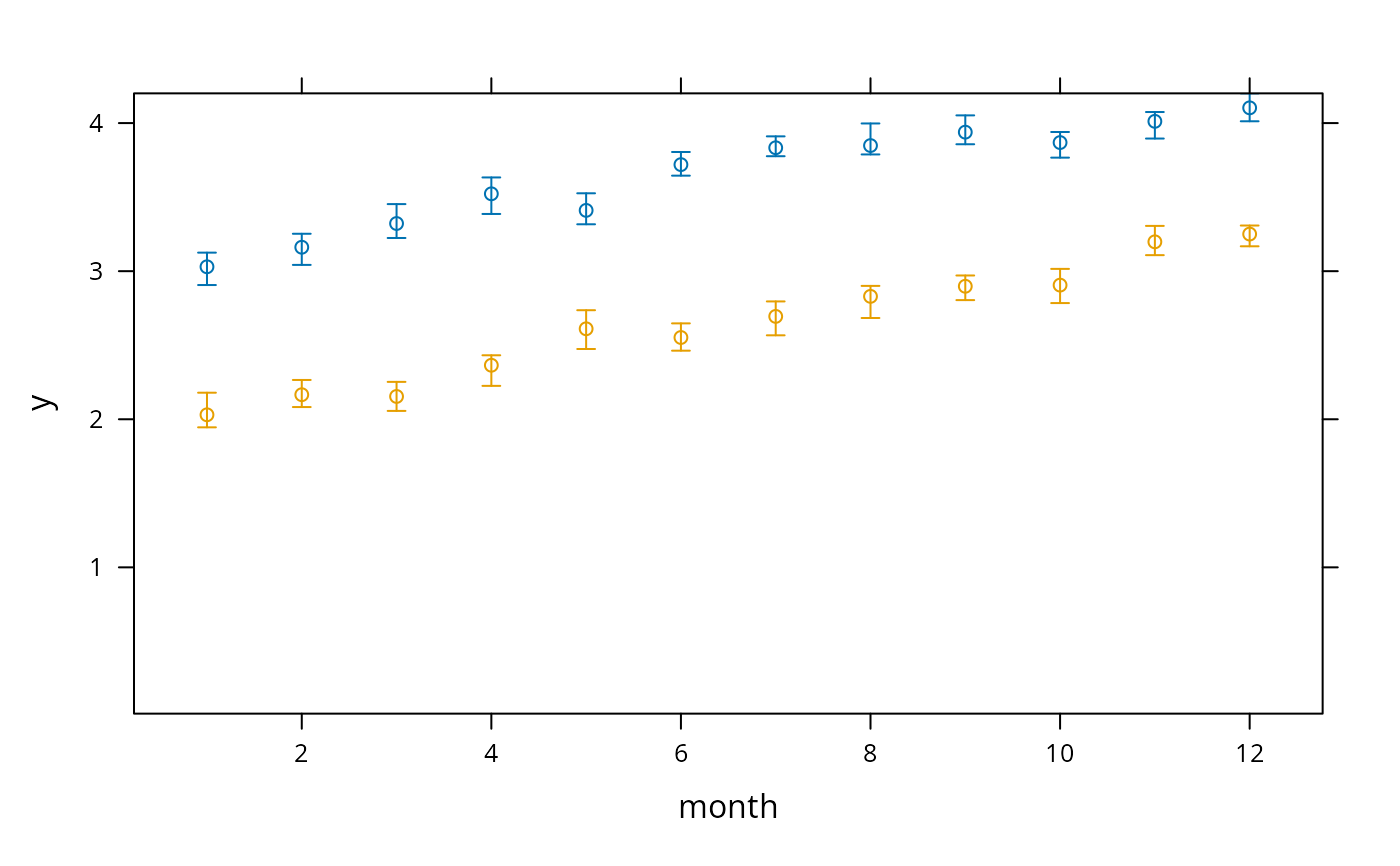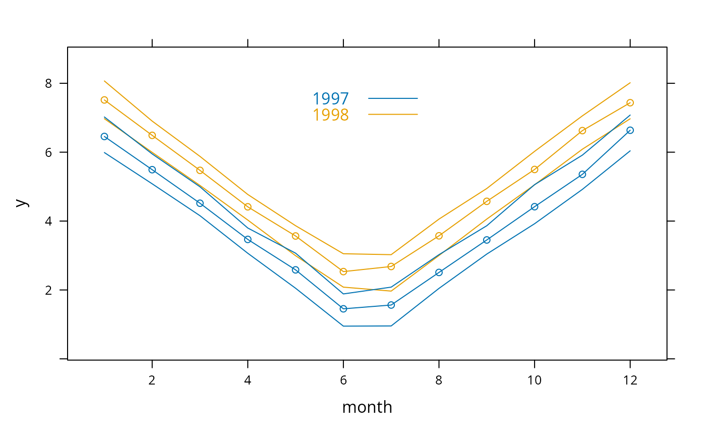 xYplot ( Cbind ( y, Lower, Upper ) ~ month, groups=year,