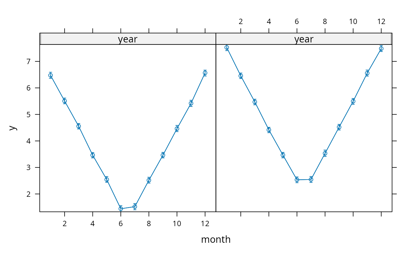 xYplot(y ~ month | year, nx=FALSE, method=smean.cl.boot, type='b')