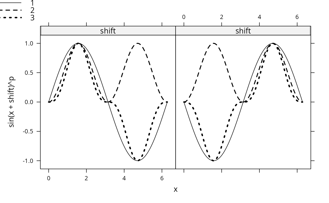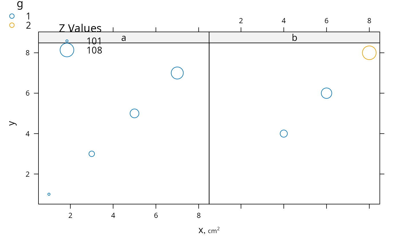 # Dotplot(z ~ x | g1, groups=g2); Key()