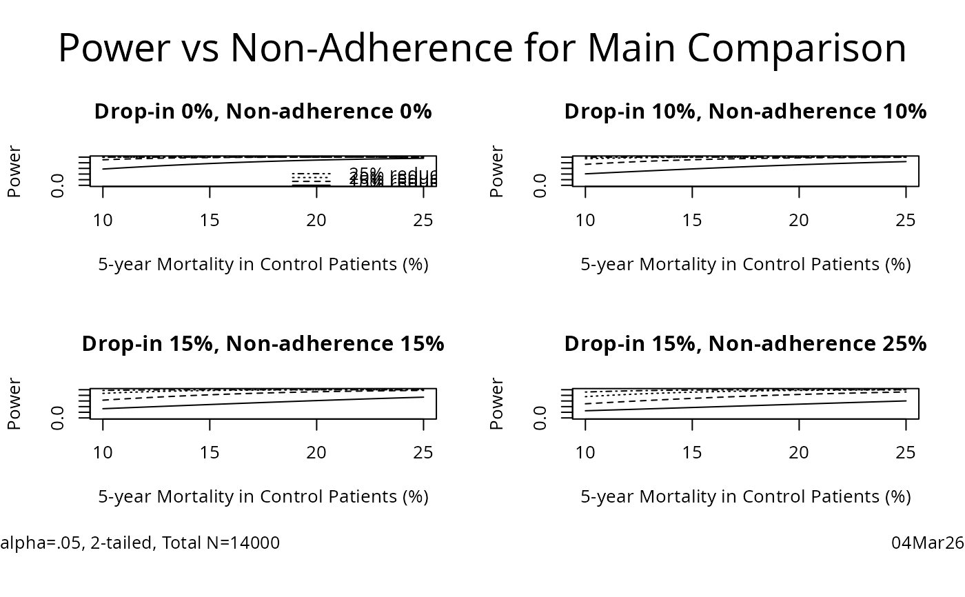 mtitle("Power vs Non-Adherence for Main Comparison",