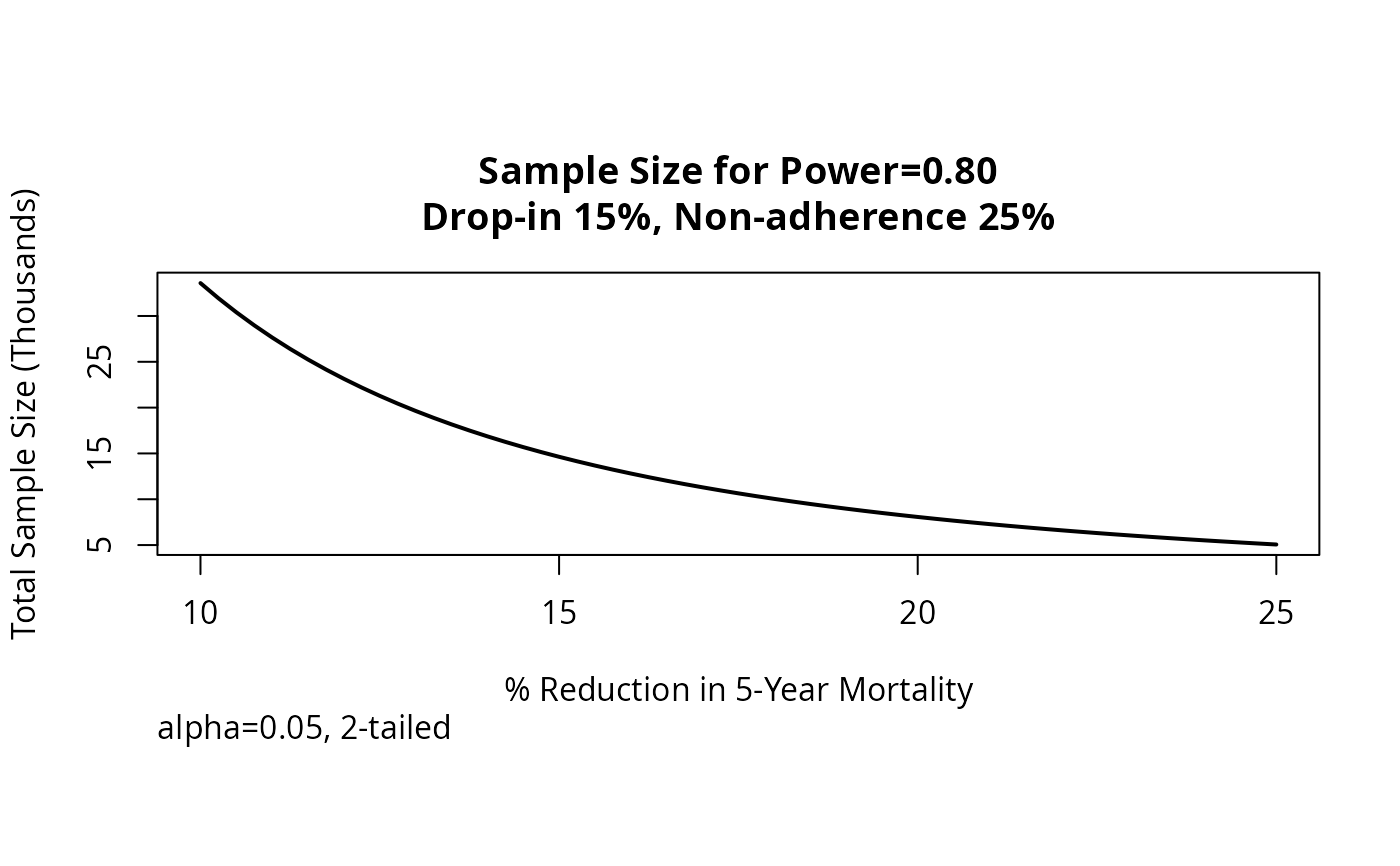 plot(red, samsiz, xlab='% Reduction in 5-Year Mortality',