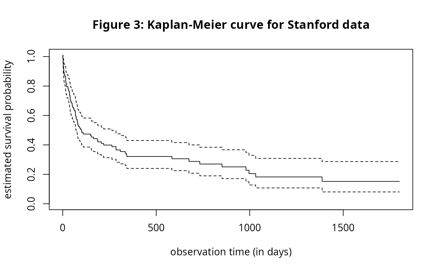 title('Figure 3: Kaplan-Meier curve for Stanford data', cex=0.8)