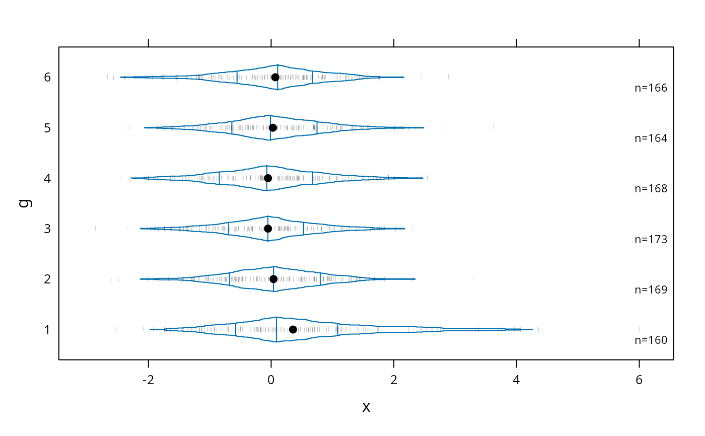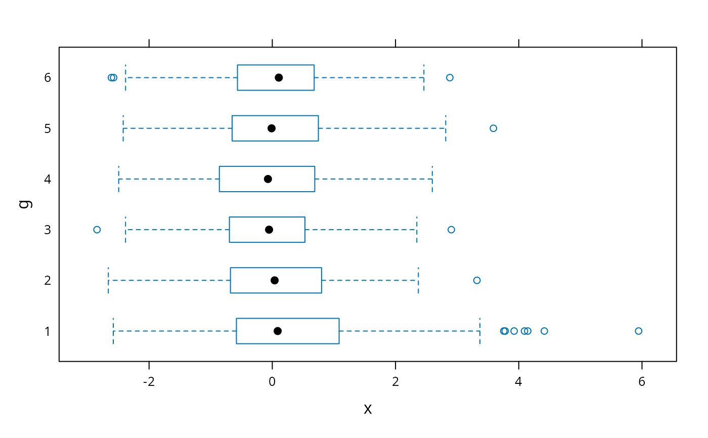 bwplot(g ~ x, panel=panel.bpplot, cex.means=.3)