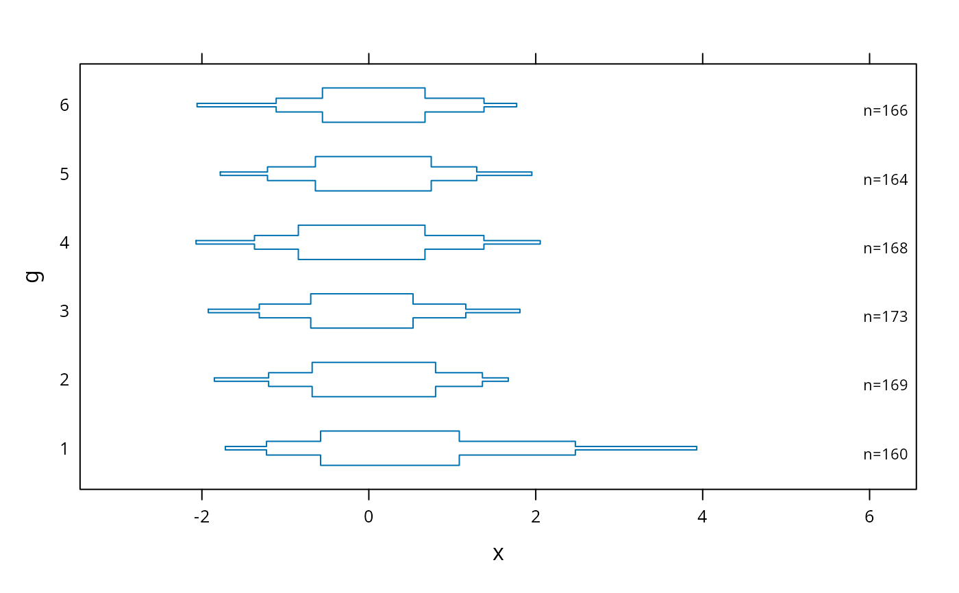bwplot(g ~ x, panel=panel.bpplot, nout=5)