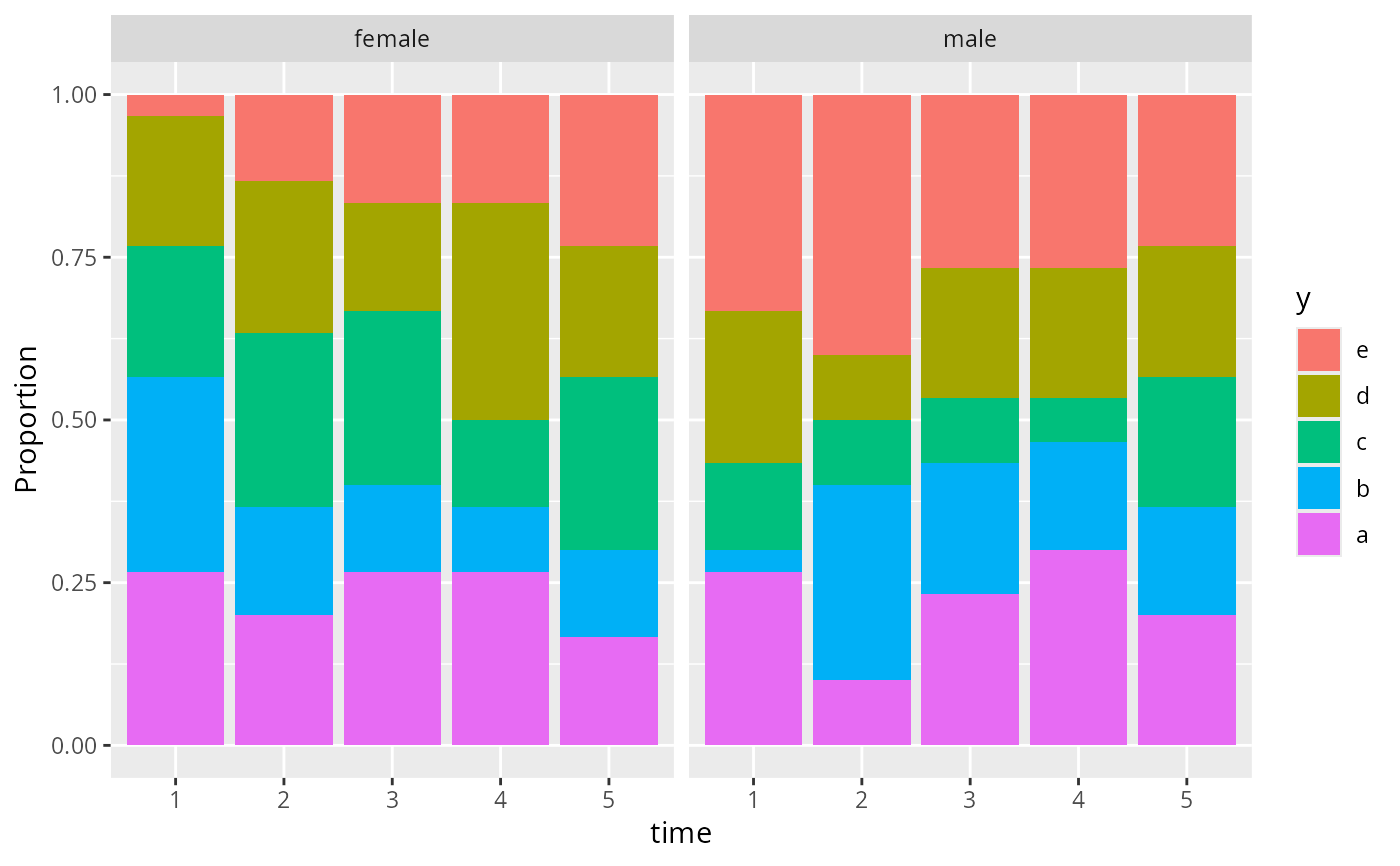 proposPOwhere the outcome categorical variable is on the left hand side and the grouping variable is on the right. It is assumed that the left hand variable is either already a factor or will have its levels in the right order for an ordinal model when it is converted to factor. FormultEventChartthe left hand variable is a categorial status variable, the first right hand side variable represents time, and the second right side variable is a unique subject ID. One line is produced per subject.- ref
