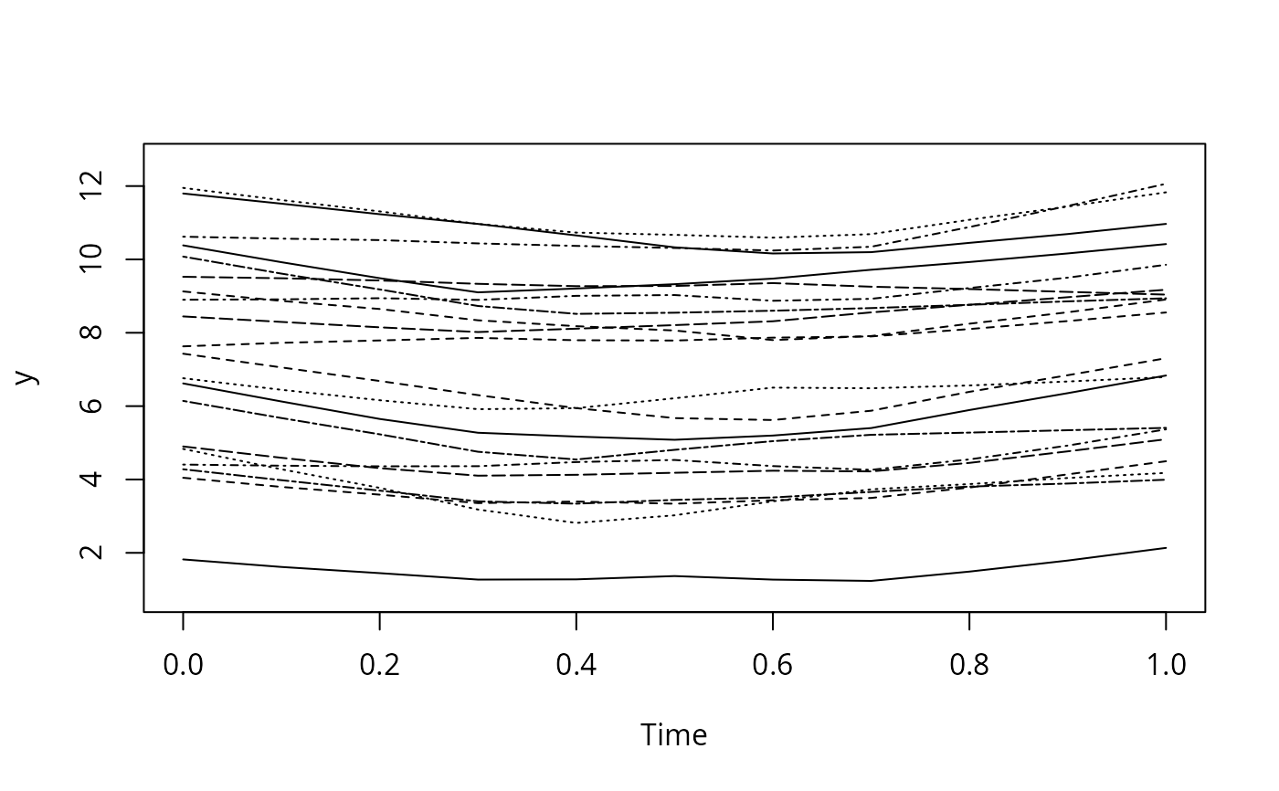 y <- matrix(rep(ey,n), ncol=nt, byrow=TRUE) + errors +