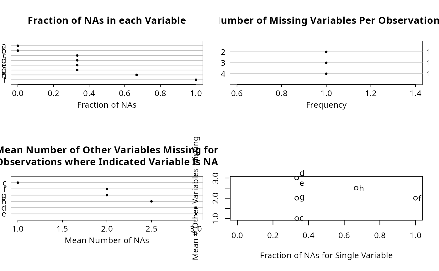 "all"meaning to havenaplotmake 4 separate plots. To make only one of the plots, usewhich="na per var"(dot chart of fraction of NAs for each variable), ,"na per obs"(dot chart showing frequency distribution of number of variables having NAs in an observation),"mean na"(dot chart showing mean number of other variables missing when the indicated variable is missing), or"na per var vs mean na", a scatterplot showing on the x-axis the fraction of NAs in the variable and on the y-axis the mean number of other variables that are NA when the indicated variable is NA.- abbrev