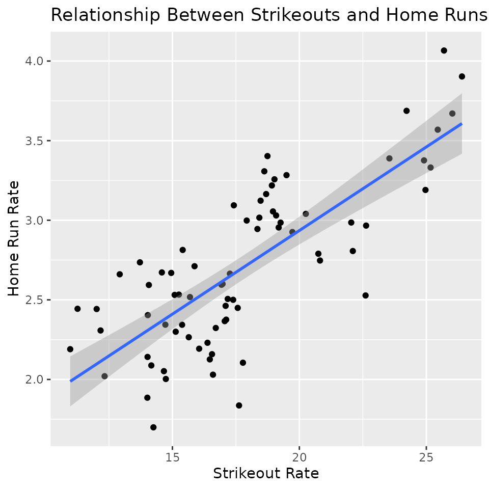 strikeoutsandhr.RmdThis vignette looks at the relationship between rate of strikeouts and home runs from the year 1950+. This question was inspired by Marchi and Albert (2016), “Analyzing Baseball Data in R.”