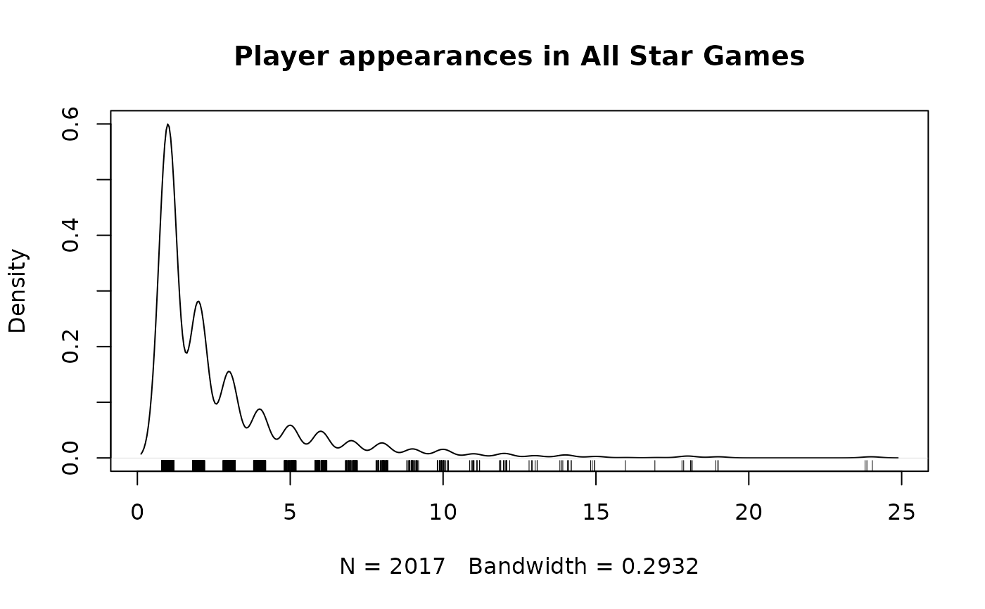 plot(density(player_appearances), main="Player appearances in All Star Games")