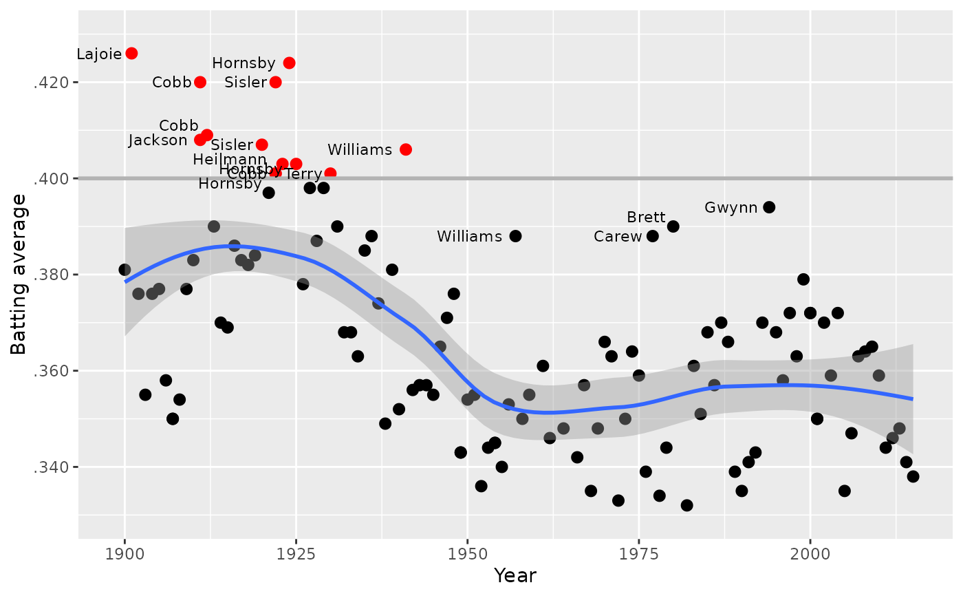 # Sub-data frame for the .400 hitters plus the outliers after 1950