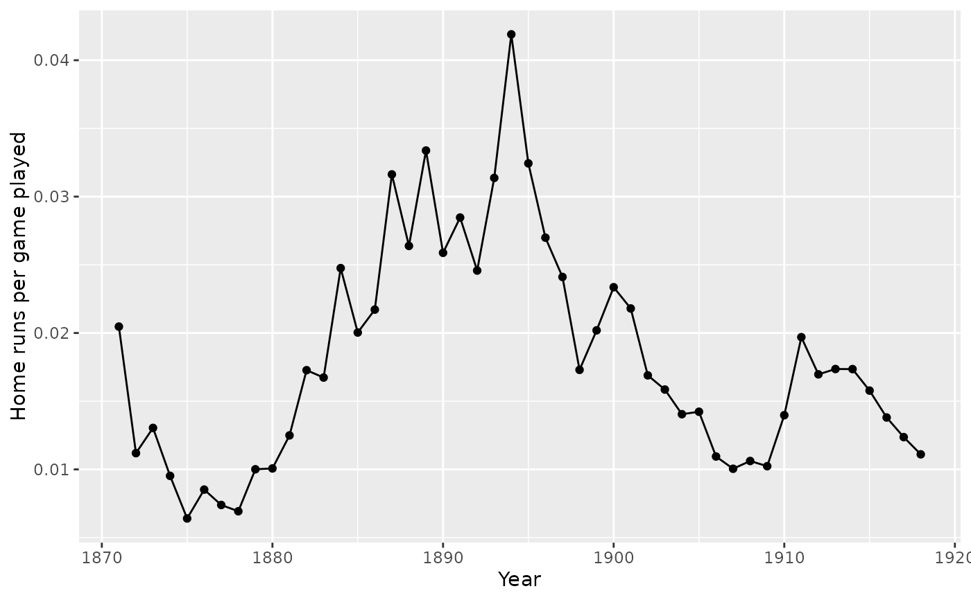 labs(x = "Year", y = "Home runs per game played")