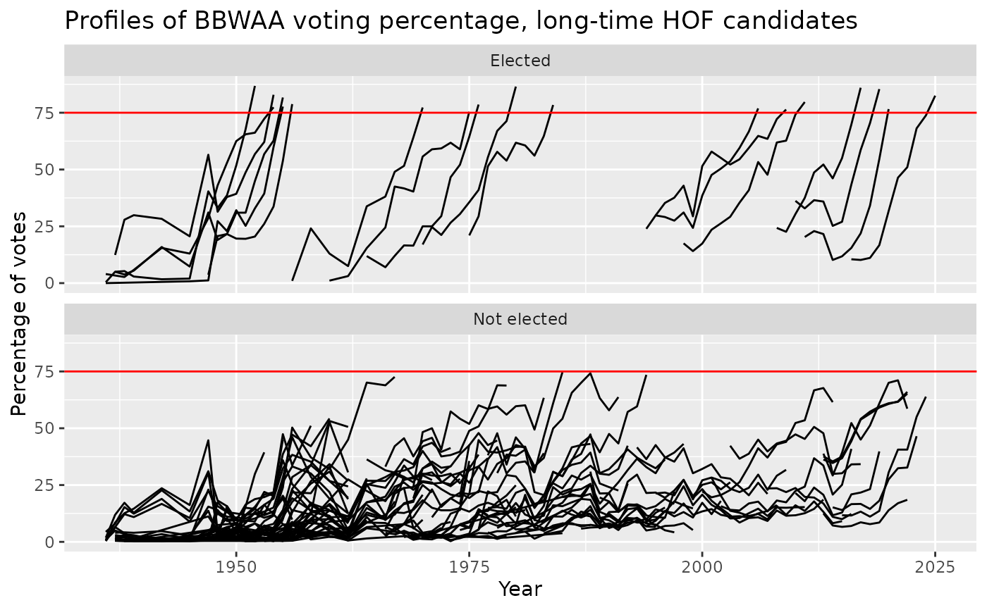 ggtitle("Profiles of BBWAA voting percentage, long-time HOF candidates") +