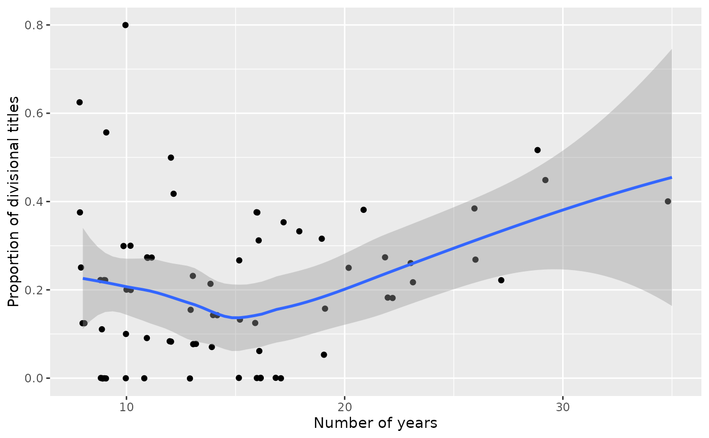 ggplot(., aes(x = nyear, y = round(nfirst/nyear, 3))) +